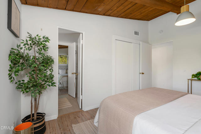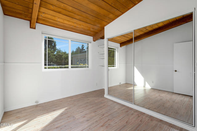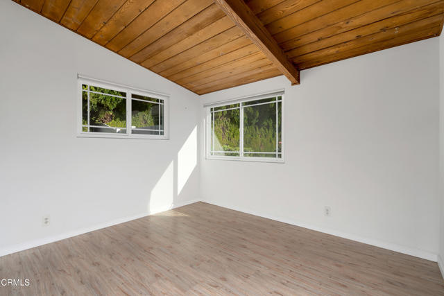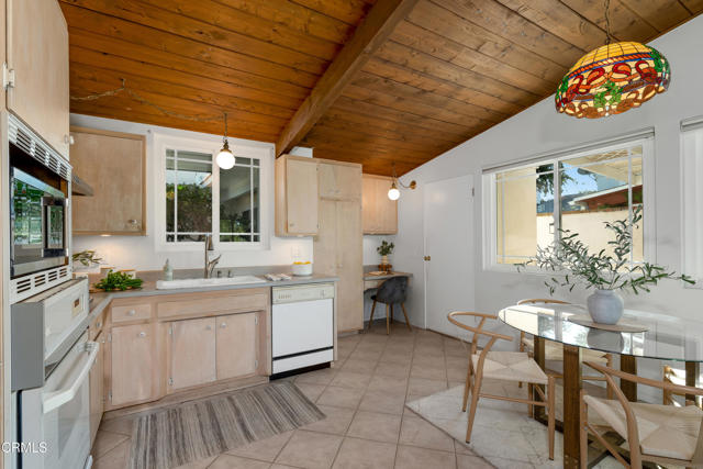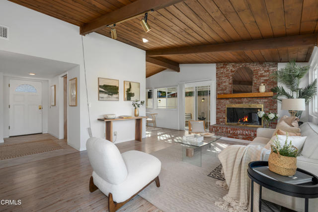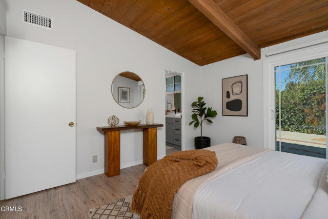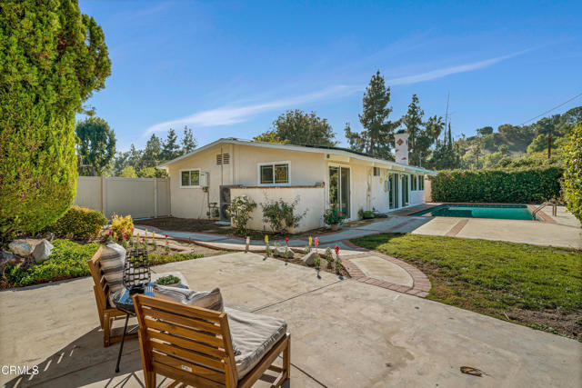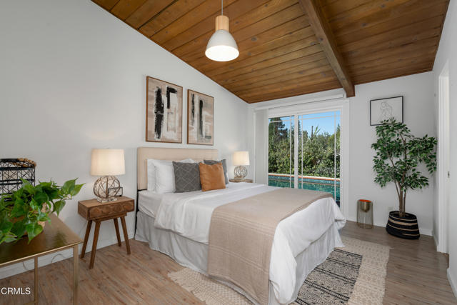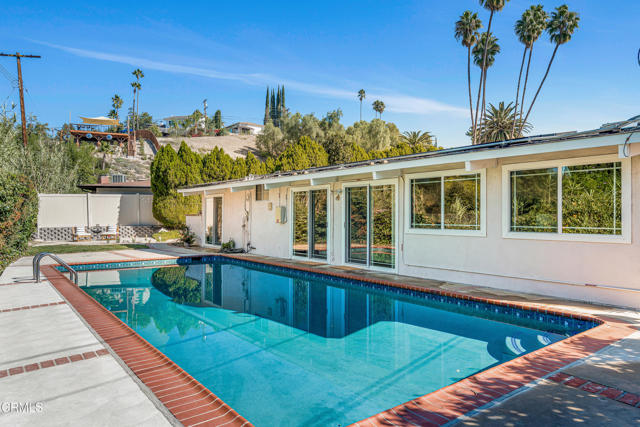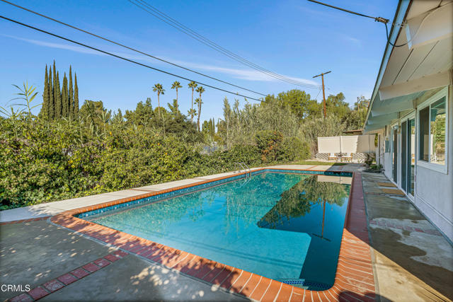Nestled on a peaceful flat cul-de-sac south of Ventura Boulevard, this mid-century modern retreat with a pool, blends indoor/outdoor living, energy efficiency, and a coveted Woodland Hills lifestyle. The open floor plan showcases exposed wood beam ceilings, airy volumes, and a seamless connection to the outdoors through multiple sliding glass doors leading to the pool, multiple patios, and private yard, creating the ideal setting for relaxed living and effortless entertaining. The kitchen, living, and dining areas flow seamlessly, oriented toward the sparkling pool and side dining patio for year-round enjoyment of California's indoor-outdoor lifestyle. Owned and paid-off solar panels (installed 2022), a newer roof (2022), EV charger, tankless water heater (2024), newer HVAC system (2022), upgraded insulation and ducting, 200-amp panel, and updated plumbing and windows provide modern efficiency and peace of mind while preserving the home's special architectural character. Featuring 4 bedrooms and 1.75 baths, including a spa-like remodeled Jack & Jill marble tile finished bath, the home offers flexible living spaces ideal for today's lifestyle needs whether it be creative workspace, a wellness room, or guest accommodations. Multiple access points to the yard and pool from the main living areas and bedrooms enhance the home's resort-style feel. Conveniently located near Woodland Hills' favorite local hotspots, it is minutes to Bristol Farms, Starbucks, Handel's Ice Cream, boutique fitness studios, and both trendy and legendary dining spots along Ventura Boulevard. The Commons at Calabasas, multiple shopping destinations, hiking trails, and weekend farmers' markets are all nearby, providing an array of lifestyle amenities just moments from home. Situated on an 8,646 sq ft lot, and first time on the market in nearly 30 years, this is a rare opportunity to own a pool home with architectural charm, energy-smart features, and a quiet, tucked-away setting close to everything that makes Woodland Hills one of the most desirable communities in the Valley.
