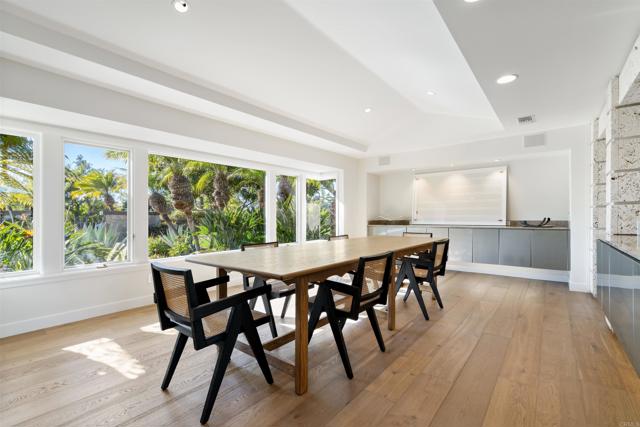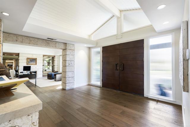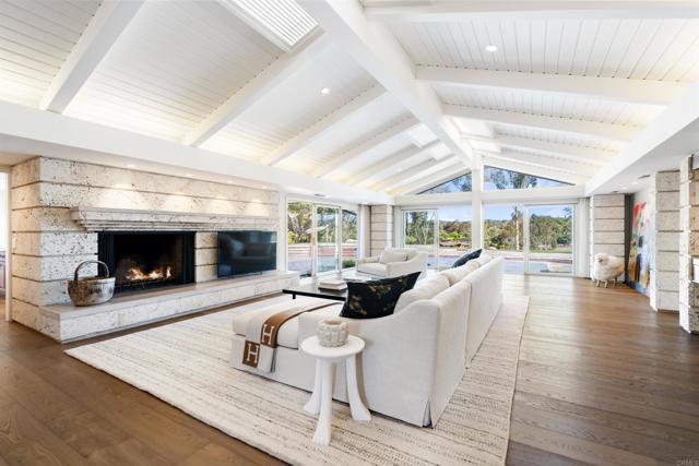 Tucked along one of the Covenant’s most desirable west-side streets in Rancho Santa Fe, this beautifully single-level estate blends timeless sophistication with serene golf course views. Set on 4.5 acres of lush, mature landscaping, the home spans approximately 6,900 square feet of warm, contemporary-inspired interiors designed for effortless living and elegant entertaining. Inside, five spacious bedrooms, an office, four full baths, and two powder rooms are thoughtfully arranged around inviting gathering spaces. The gourmet kitchen, equipped with top-tier appliances, opens to a light-filled family room featuring dramatic high ceilings with wood detailing, a striking coral stone fireplace, and expansive glass doors that frame breathtaking golf course views. Multiple skylights fill the home with abundant natural light, creating a bright and airy atmosphere throughout. Nearby, a game room and sunroom offer flexible spaces for relaxation or entertaining. The primary suite occupies its own private wing, offering a luxurious retreat complete with a fireplace, wet bar, spa-like bath with steam shower, and dual dressing rooms. A secondary bedroom is conveniently located next to the primary suite—ideal for a nursery, gym, or additional office. On the opposite side of the home, three additional bedroom suites provide comfort and privacy for family or guests. Outdoors, the property lives like a private resort with a sparkling pool and spa, tranquil water feature, built-in BBQ, and expansive lawns surrounded by nature. The estate also includes owned solar, two detached storage buildings, a three-car garage, and a private gate. Just moments from the Covenant’s scenic trails, village shops and dining, golf and tennis clubs, and the acclaimed Roger Rowe School, this exceptional property captures the very best of Rancho Santa Fe living — refined, relaxed, and effortlessly elegant.