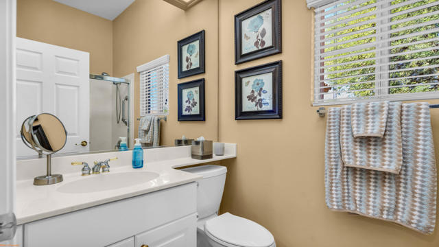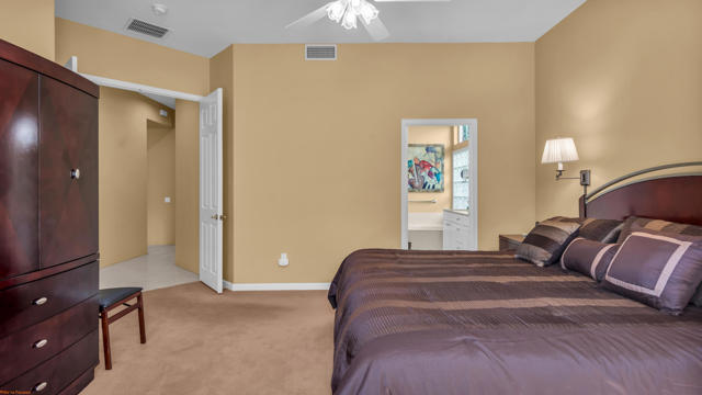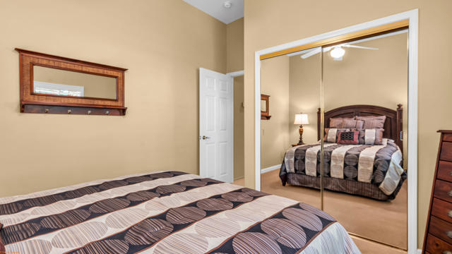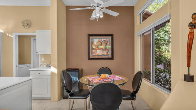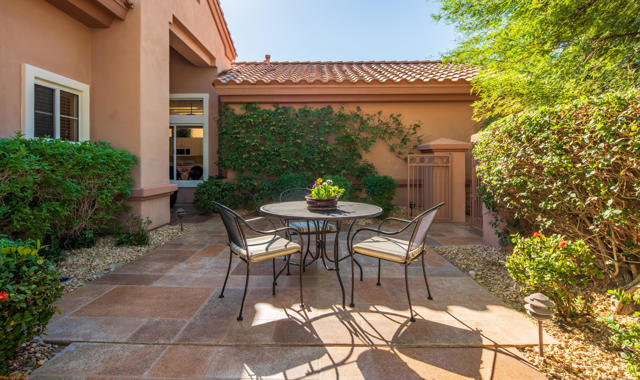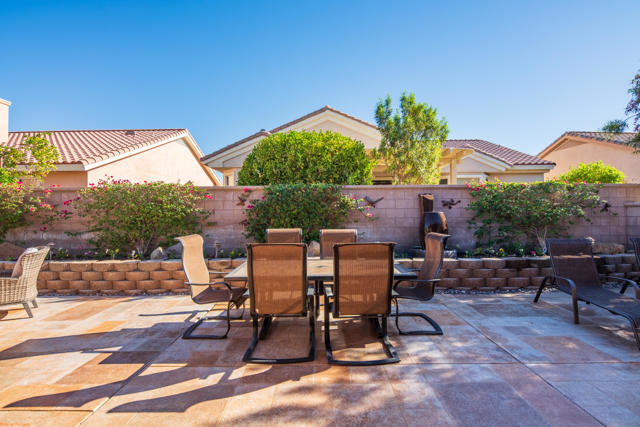 You'll fall in love with this beautifully maintained 2-bedroom, 2-bath Fostoria model home! From the moment you arrive, the stamped concrete entry and lush gated courtyard set a welcoming tone. Step inside to an open floor plan featuring 10-foot ceilings, transom windows, and designer paint that create a bright, spacious feel. Tile flooring flows throughout the main living areas, with cozy carpet in the bedrooms.The inviting great room offers plenty of windows that bring the outdoors in, while the kitchen is a cook's delight--complete with a skylight, pantry, oversized prep island, and abundant cabinet space. French doors from both the great room and den open to an entertainer's backyard, featuring a relaxing leisure area, raised planter, and a fire pit--ideal for gatherings or quiet evenings under the stars.The primary suite features double French door entry, a bath with dual vanities, soaking tub, and separate shower highlighted by a decorative glass block window that fills the space with natural light. A spacious walk-in closet includes built-in organizers for convenience. The guest bedroom and bath are thoughtfully located on the opposite side of the home for added privacy. It is offered furnished at no additional value (some exclusions apply). Additional highlights include ceiling fans, an indoor laundry area, and a two-car garage with storage cabinets and a utility sink. This home truly offers comfort & style--ready for you to move in and enjoy!