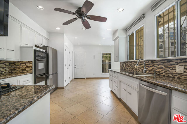 Charming 1920s townhouse-style duplex with hardwood floors, floor-to-ceiling windows providing lots of natural light, in-unit washer/dryer, & rear garage (large 1 car garage + 1 driveway spot). Downstairs offers a spacious living room, large dining room w wood beam ceilings, & oversized kitchen with full appliance package (microwave, new double oven, fridge, dishwasher, gas range) large breakfast area & a half bath. Upstairs features 3 bedrooms + 2 bathrooms. The front bedroom offers 2 large walk-in closets (one could be an office), a second BD with ample closet space & bathroom in-between the 2. The primary bedroom boasts double closets, vanity space, built-ins for storage, & an en-suite BA providing dual vanity, tub/shower, + large linen closet. Grassy courtyard, timeless character & unbeatable Beverly Grove location complete this rare offering.
