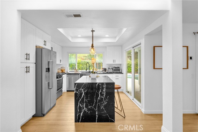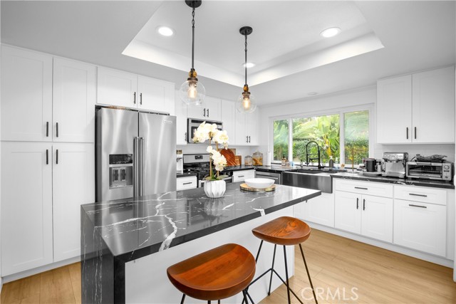 Welcome to this beautifully remodeled home in the heart of Mission Viejo, where modern elegance meets everyday comfort. This stunning residence features 3 spacious bedrooms, 3 brand-new bathrooms with luxurious finishes, and durable 9-inch laminate flooring throughout. Soaring vaulted ceilings and large windows fill the home with natural light, creating an open and inviting ambiance. The fully updated kitchen boasts brand-new shaker cabinets, quartz countertops, soft-close drawers, and picturesque views of the lush backyard. The serene primary suite offers a tranquil retreat with views of the yard, a spa-like ensuite featuring double vanity sinks, and a fully remodeled shower. Step outside to your private backyard oasis, complete with a sparkling pool, spa, covered patio, and fruit trees, perfect for relaxing or entertaining. Nestled in a peaceful neighborhood within a top-rated school district, this home offers convenience with nearby shopping, dining, and easy access to Highway 405. Combining style, functionality, and an unbeatable location, this home is a true gem waiting to be yours! Homeowners are open to receive 6 to 12 months rent upfront. Available for showing as of Saturday Nov/08th.