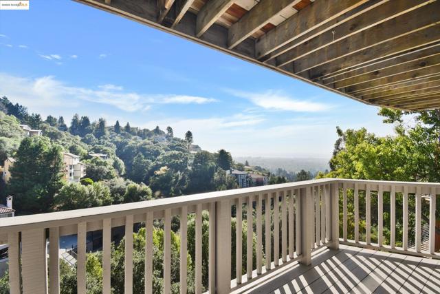 Nestled in the exclusive Claremont Hills this residence offers soaring ceilings, sliding glass doors, and on a clear day, enjoy captivating peekaboo views stretching across the Bay to SF. The main level welcomes you with sun-filled open living spaces, anchored by a striking fireplace and framed by sliding glass doors that open onto a wraparound balcony. From here, take in sweeping vistas of lush greenery and city lights below—an ideal setting for both entertaining and quiet evenings. The formal dining area flows seamlessly from the living room, while the well-appointed kitchen offers granite counters, and stainless appliances. The second floor features the primary suite—a true retreat with a private balcony, and a luxurious sunken tub. Downstairs, a separate entrance reveals a full secondary living space complete with its own kitchen living room, and two bedrooms. Additional highlights include a dedicated laundry room, a two-car garage, and a generous bonus storage room. Outdoor living is equally impressive, with multiple balconies and decks offering ample space to relax, entertain, and take in the natural beauty of the Berkeley Hills. Prime location w/quick access to the Claremont hotel, Elmwood & Rockridge shopping the freeways and Starr market