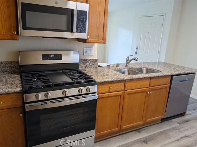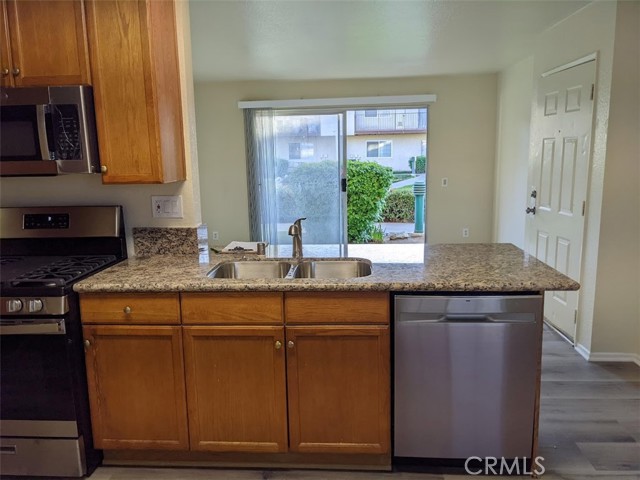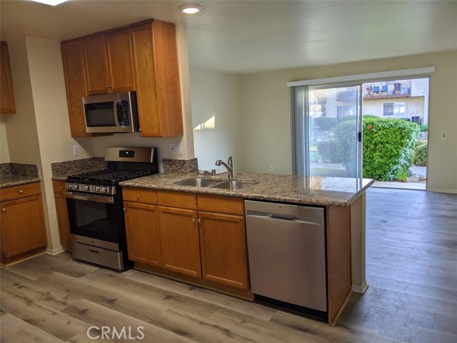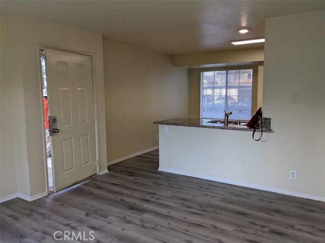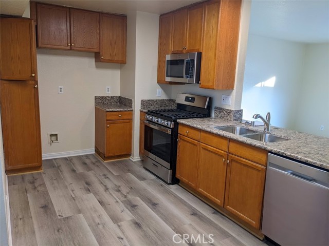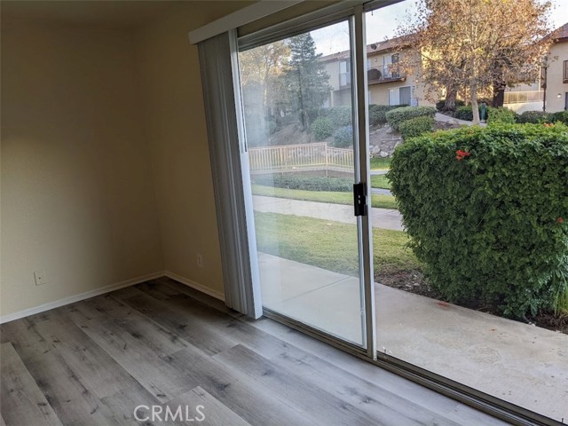 Recently updated condo in gated Marbella Community located in Mentone (unincorporated area near Redlands, CA). 1 bed, 1 bath, ground floor unit with 1 car garage and 1 assigned parking, features newer vinyl plank flooring and newer interior paint. The kitchen has a newer granite countertop with bar seating, a newer stainless steel dishwasher, a matching newer stove/cooktop, and a newer microwave. The living room is spacious and offers lots of natural light and a slider to the patio that overlooks the beautiful serene green belt and trees. The bedroom is generously sized, has two closets, and accesses the updated bathroom, and opens to the washer and dryer hookup laundry area. Enjoy community amenities including a swimming pool, spa, clubhouse, and greenbelts, and this community is guard-gated. Conveniently located near schools, shopping, and easy access to Yucaipa, E. Highland, and Redlands. Water and trash are included in the rent. Minimum FICO is 650, no pets, 1 cat may be accepted.