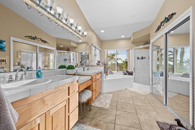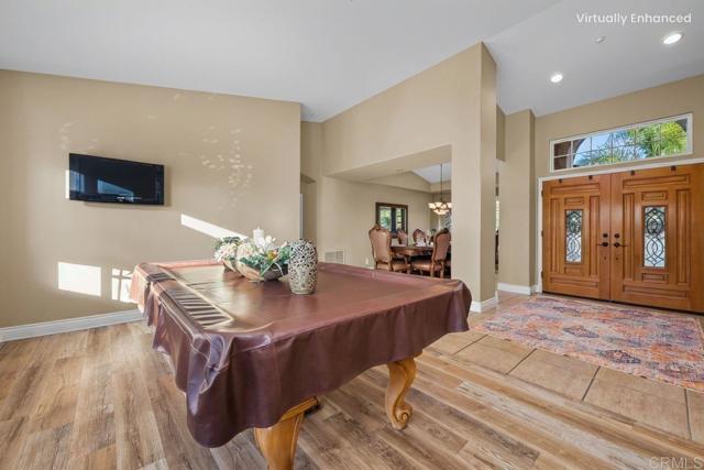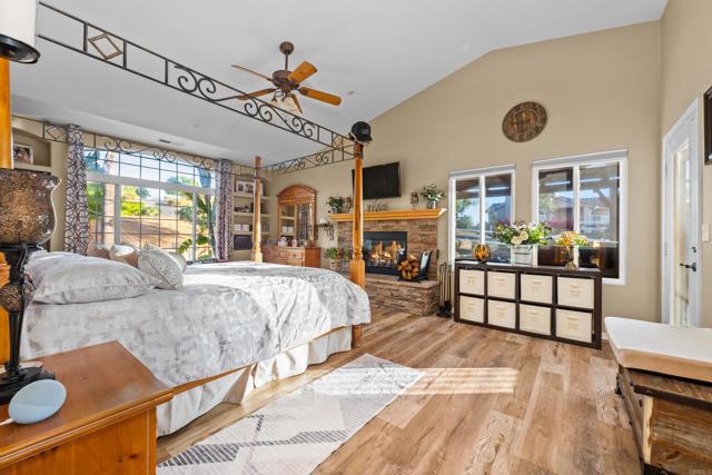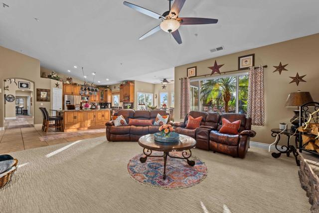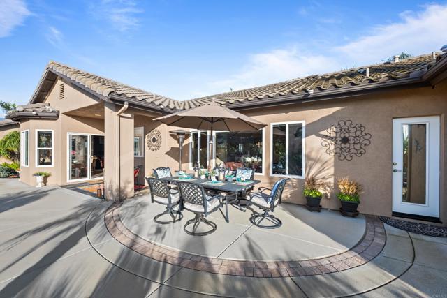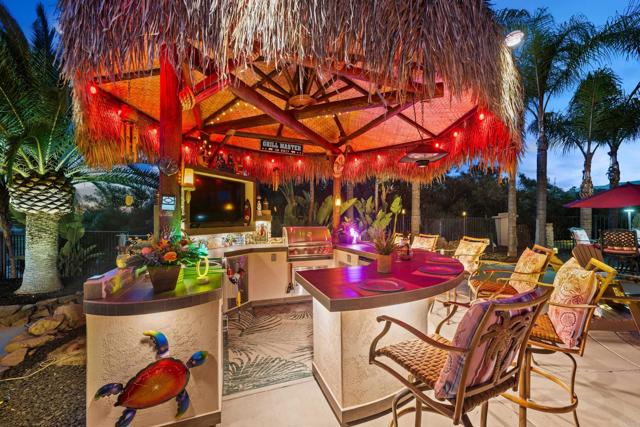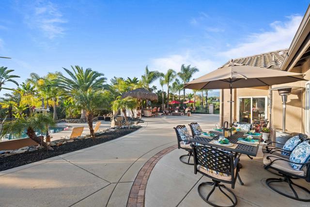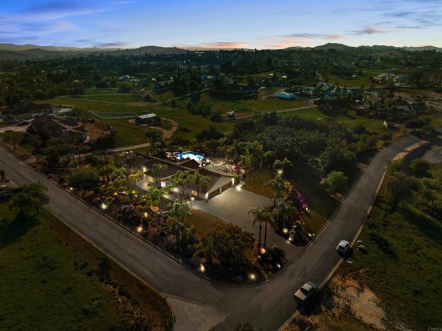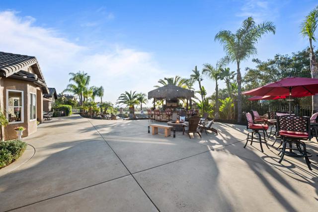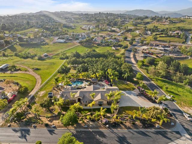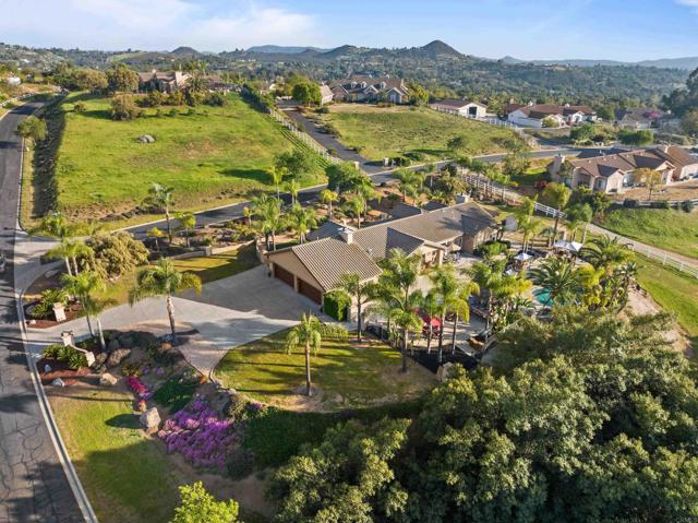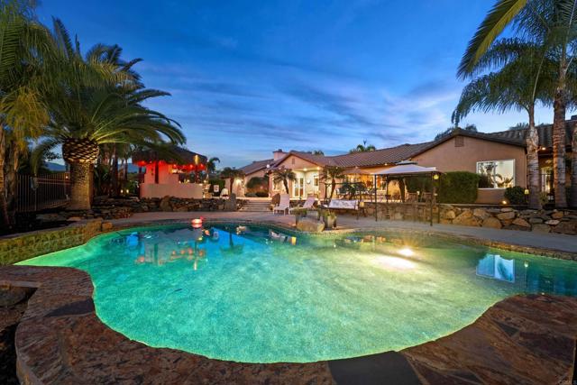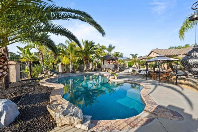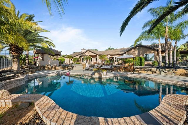 This beautifully upgraded home in a highly desired Michael Crews development of Skyridge Estates, offering craftsmanship, modern upgrades, and plenty of room to entertain, inside and out. The fully remodeled kitchen is a chef’s dream, featuring KitchenAid stainless steel appliances, an induction cooktop, granite countertops, a farmhouse-style stainless sink, and an oversized kitchen island perfect for gathering. A spacious walk-in pantry provides ample storage. The four-car garage offers epoxy flooring and newer insulated garage doors, while the newer exterior paint gives the home fresh curb appeal. Step outside to your private backyard oasis, fully fenced and designed for relaxation and entertainment. A pebble-finish pool with a Shamu step, a Palapa barbecue kitchen with an outdoor TV, and mature queen, Canary, and sago palms that create a lush, tropical feel. The covered patio off the primary bedroom makes for the perfect morning retreat. there is also a flat usable area for RV garage or horse setup. No HOA and close to local high school. This home combines luxury, functionality, and outdoor living — the perfect blend for Valley Center living.