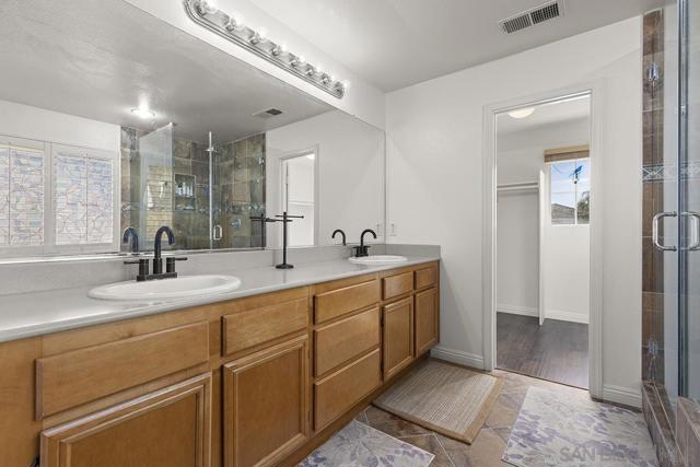 Riveting River Ranch estate in a coveted gated community featuring 5 bedrooms, 3 bathrooms with 1 full bedroom and bathroom downstairs. Exceptional hardwood floors downstairs and freshly painted interior brings you this spacious home. Upon entry you are greeted with your formal living and dining areas. Seamless flow to your chef's kitchen featuring upgraded counters, large center island, gas range, and pantry storage all open to your informal dining area and cozy family room. Private and refreshed landscaping in your entertainer's yard. Upstairs features your oversized primary bedroom and ensuite bathroom with dual sinks, separate tub and walk-in shower, and generous sized walk-in closet. 3 secondary bedrooms upstairs plus a loft, perfect for in home entertainment, relaxing, and more. 3 car attached tandem garage. Complex features a community pool, spa, greenbelts, playground, BBQ, and more. Just minutes to San Luis Rey River Trail, plenty of shopping in Walmart, Lowe's, Ralph's, restaurants, banking, and more. This is a must see!