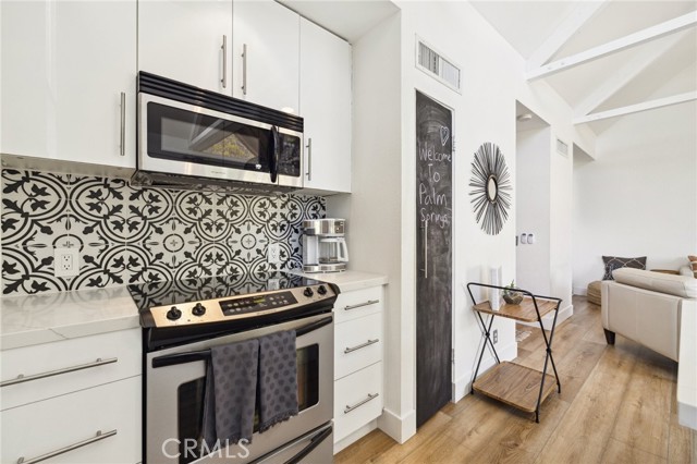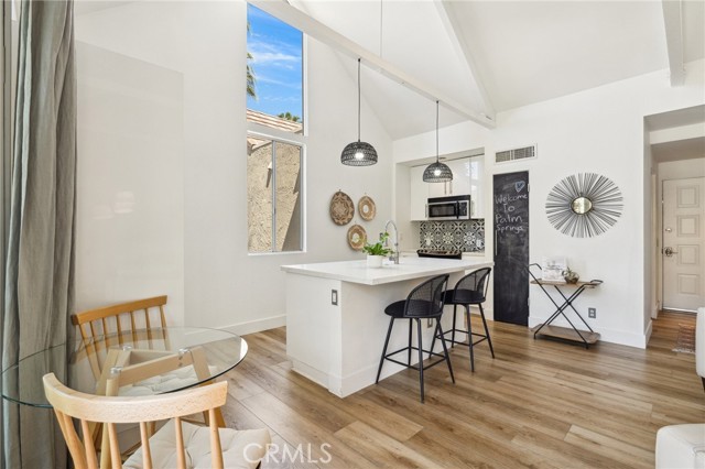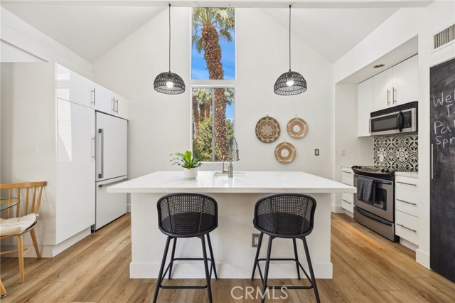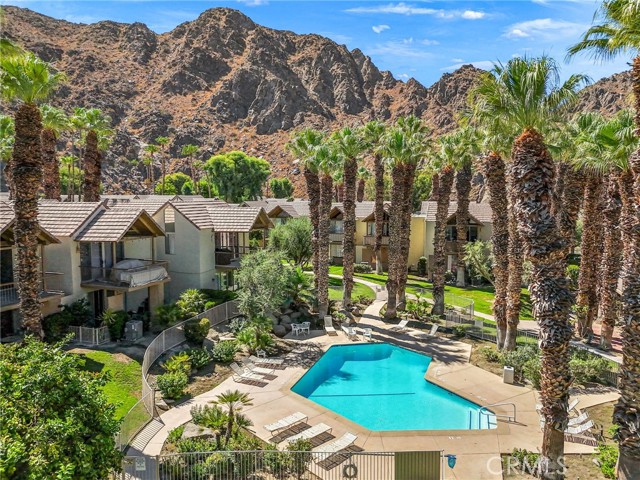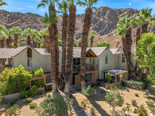 Welcome to resort style living tucked in the scenic mountains of Indian Wells. This adorable recently updated modern 2 story condo is located in the desirable Mountain Cove community. As you step inside, high ceilings frame breathtaking mountain views through the patio slider, creating an immediate sense of tranquility. The porch slider opens up in both directions to bring the outside in. The unit boasts a new fridge, backsplash, counter top sink, and new flooring upstairs. Both king size bedrooms downstairs feature sliding doors opening up to your own private patio. The downstairs bathroom has been fully remodeled. A stacked washer and dryer, central heating, and air conditioning enhance convenience. Enjoy access to a community pool just steps away.