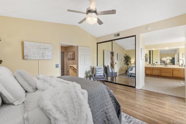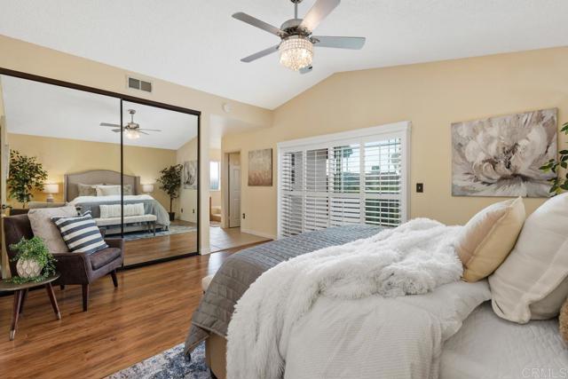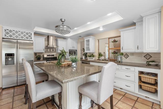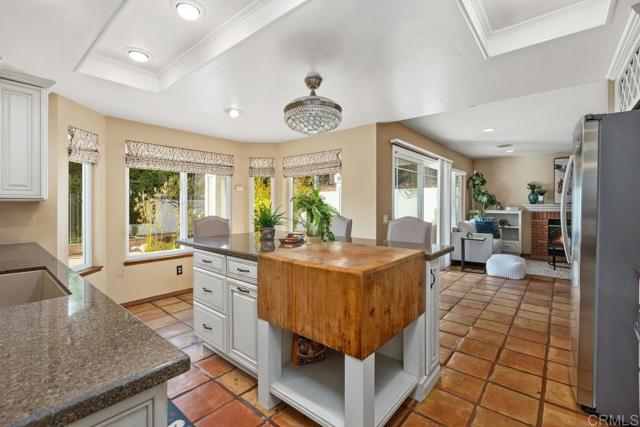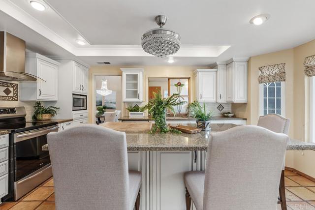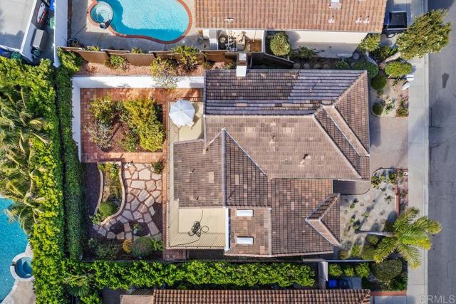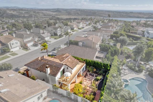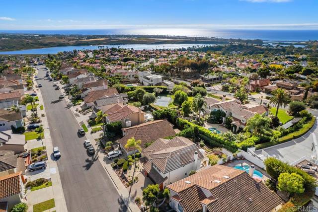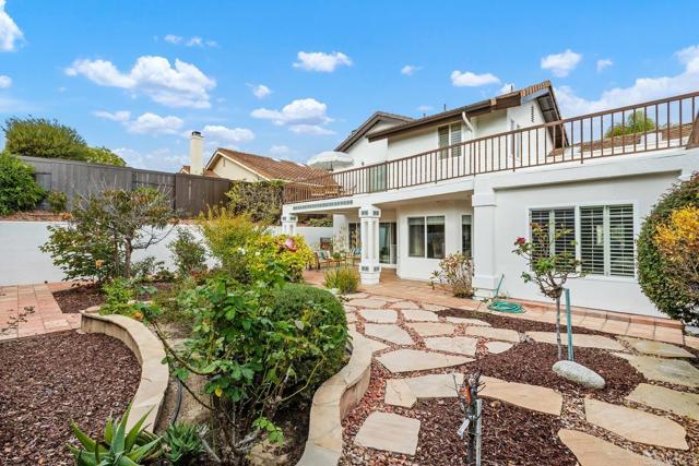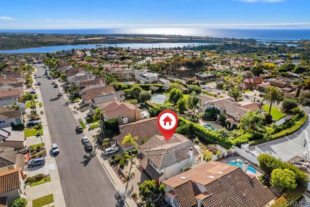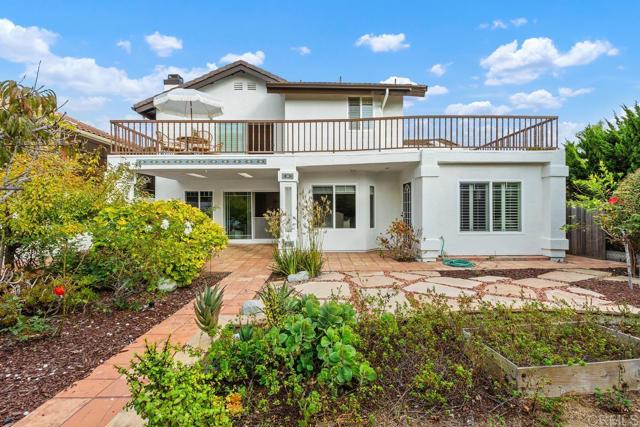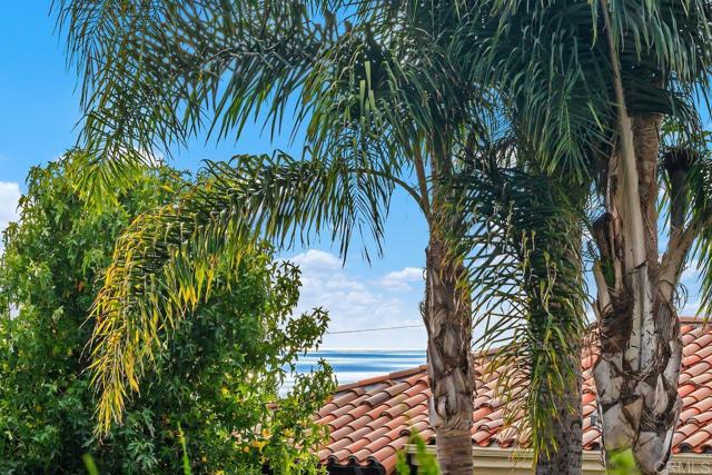 Enjoy the best of beach life in this beautifully maintained Telescope Point home, featuring Agua Hedionda Lagoon views in front and a peek of the Pacific from the back upper deck. Just minutes from Tamarack State Beach and Carlsbad Village, enjoy easy access to restaurants, boutique shopping, and the weekly farmer’s market. This peaceful neighborhood is known for its ocean breezes, pride of ownership and the nearby top-rated Carlsbad schools. Neighborhood ocean view parks are a short stroll away. This home offers 3 bedrooms upstairs, a main-level bonus room, and 2.5 baths, plus a private backyard retreat. The inviting curb appeal features fresh exterior paint, a paver driveway, new roof (2024) and drought-tolerant landscaping. Inside, vaulted ceilings with exposed beam, skylights, plantation shutters, and Saltillo tile create a bright, airy ambiance. The updated chef’s kitchen includes creamy custom cabinetry, a large quartz island with breakfast bar and butcher block, wine storage, stainless steel appliances (Bosch dishwasher and Frigidaire induction range and warming drawer), and opens to a cozy family room with a brick fireplace and backyard access. The permitted main-level bonus room, complete with built-in desks and a private exterior entrance, offers flexible use as an office, guest space, or studio. Step outside to a private garden oasis with covered patio, meandering paver paths, and mature persimmon and peach trees, plus roses, plumeria, and hydrangeas—perfect for year-round indoor-outdoor living. Upstairs, the spacious primary suite features western views, access to a large deck with peek ocean views, and a sunlit ensuite bath with dual vanity, walk-in shower, soaking tub, and ample closet space. Two additional bedrooms share a hall bath with dual vanity and tub-shower combo; one includes a walk in closet and charming window bench with built-in storage. Low HOA fees include access to tennis courts, basketball, a picnic area, and available RV parking.