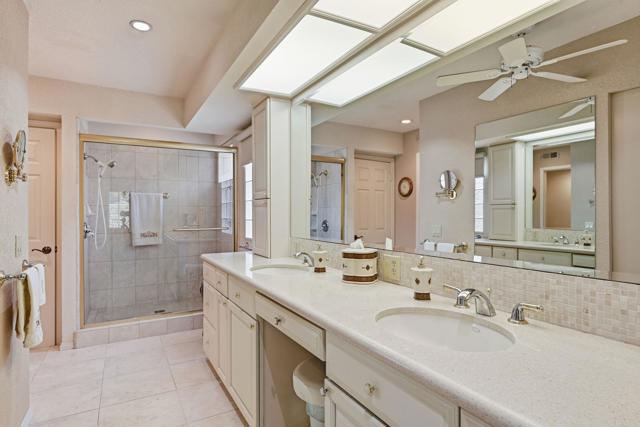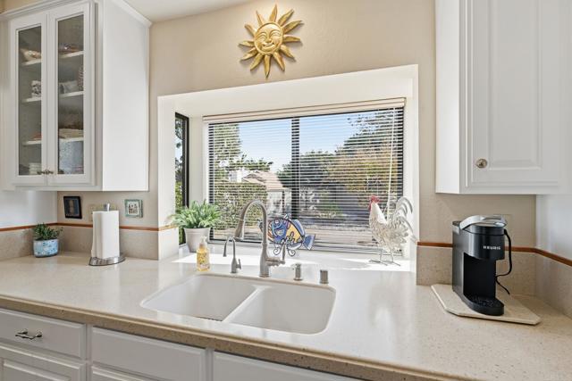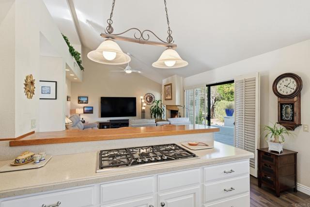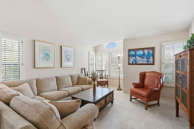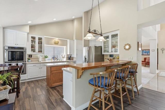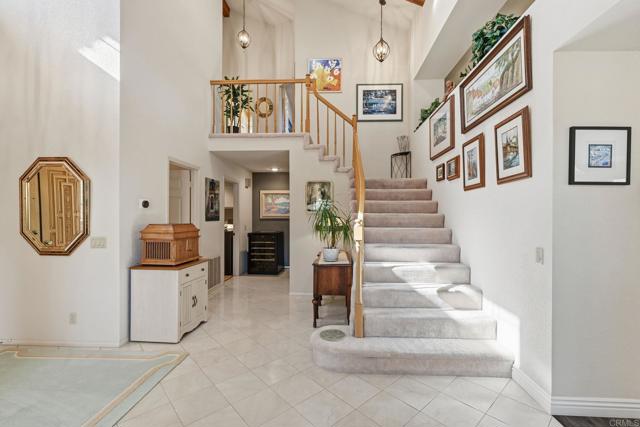 Fabulous cul-de-sac Shadowridge home with primary suite and all essential rooms (including laundry) on the main floor offering the ease and comfort of single-level living. *** Open floor plan with great architectural detail and abundant natural light featuring high vaulted ceilings, porcelain plank floors, marble entry, plantation shutters, and cozy fireplace. *** Kitchen boasts Corian countertops, center island, double ovens, built in microwave, LG French door refrigerator and plenty of storage. *** Additional features include owned solar, AC, ceiling fans, NEST thermostat & ring, oversized 2-car garage. *** Large private lot with generous back and side yards are highlighted with tiled patio perfect for that morning coffee, family barbecues or basking in the California sun! *** Close to Shadowridge Golf Club, parks, downtown Vista or access to 78.