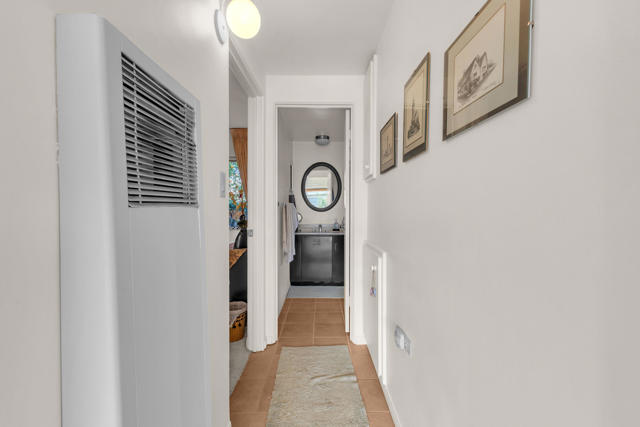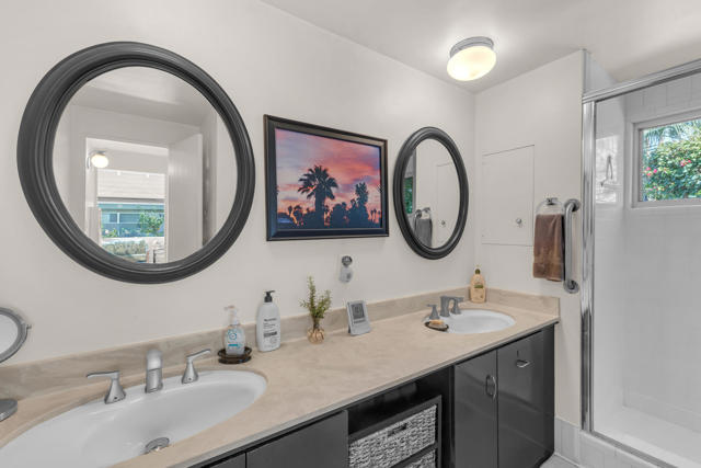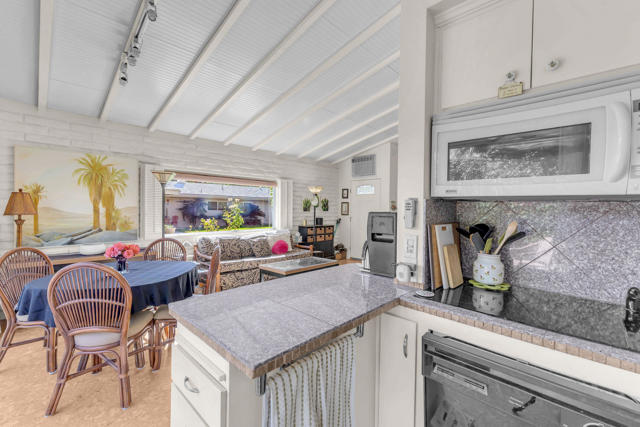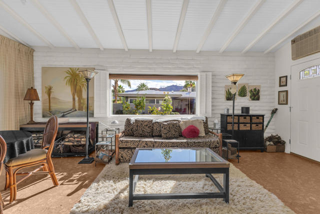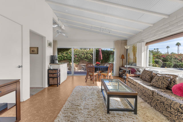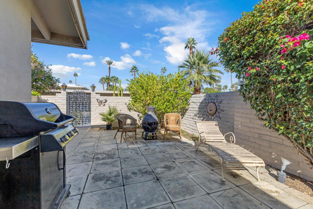 Located in the quiet rear part of Desert Braemar, this priceless gem boasts what may be the largest patio out of all of the 1 bedroom units. The paved floodlit 750 sq ft patio contains mature garden and bougainvillea hedge, key lime tree, palm tree, sprinkler system plus patio table, 6 chairs. mid century lounge chair, umbrella & natural gas Weber BBQ. Perfect for indoor outdoor living you will love the space expanding vaulted ceilings, spacious bedroom and charming bath. The cork floored living/dining area has a mirror wall that reflects the patio. The carpeted bedroom has 2 twin beds, mirrored closet doors and a sound-proofed double wall adjoining the neighboring unit.. Every amenity is yours including pool/spa, gym, library, workshop, tennis/pickleball, putting green, lawn bowling, shuffleboard, clubhouse with amazing kitchen and terrace, on site manager M-F. Your co-op monthly fee includes all amenities, maintenance, water, sewer, trash, Spectrum high speed internet plus cable including HBO and Showtime AND YOUR PROPERTY TAXES! Each unit has a designated carport with storage above. Desert Braemar is a Stock Cooperative and each owner is issued a 'stock certificate granting a specific number of shares of the complex with exclusive use of a particular unit. Cash sales only. 55+ community You will LOVE living here!.