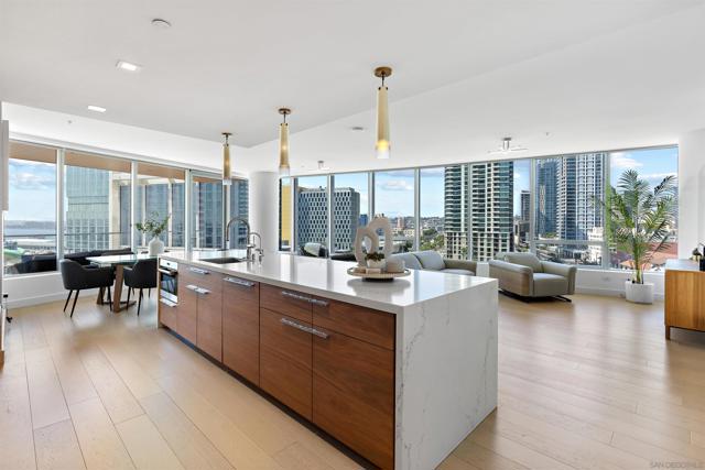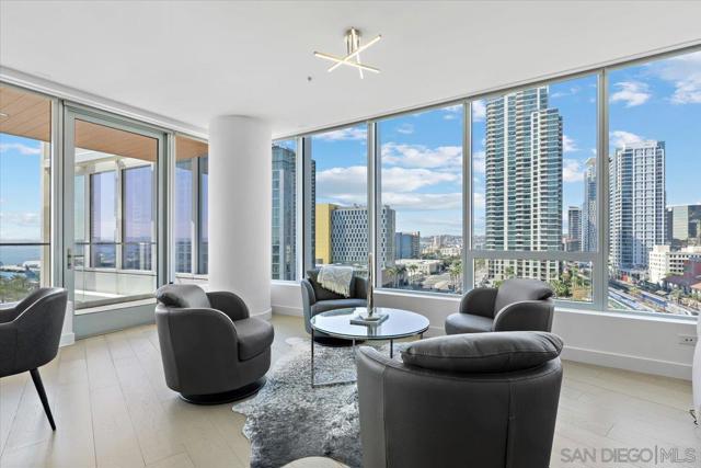 Immerse yourself in elevated coastal living at Pacific Gate, San Diego's prized residential tower. Perched on the 10th floor, this light and bright 2-bed + den, 2.5-bath corner residence captures panoramic bay and city views through sweeping walls of glass. Thoughtfully designed, this spacious layout offers an open-concept living area wrapped in natural light, a sleek chef’s kitchen with premium Wolf, Sub-Zero, and Miele appliances, and beautifully curated finishes throughout. The spacious primary suite features a spa-inspired bathroom and generous walk-in closet by California Closets, while the secondary on-suite bedroom provides privacy for guests and incredible Bay views. Den/office offers flexibility as a 3rd bed or a private home office. The large private covered terrace offers an inviting space to unwind and enjoy San Diego’s vibrant sunsets. Resort amenities include a 45' yacht share, luxury car fleet, chef concierge, a guest suite, pool terrace w/cabanas, residents lounge w/catering kitchen, a state-of-the-art fitness center w/sauna and steam room, screening room, dog run, and an onsite celebrity chef-owned restaurant. Enjoy the coastal luxury lifestyle in San Diego's only Super Prime residential tower. Pacific Gate is located in Millionaire's Row and steps from the harbor, Seaport Village, the Rady Shell, restaurants, and luxury boutique shops. The first all-glass Super Prime residential tower in San Diego offers an unprecedented waterfront lifestyle with sky-high amenities and picture-postcard views. Directly overlooking the waterfront, the 41-story tower contains an exclusive offering of homes designed by Hirsch Bedner Associates. Renowned New York-based architectural firm Kohn Pedersen Fox (KPF) created a landmark that reimaged the San Diego skyline. The custom-engineered glass walls dynamically reflect the hues of the sky and the Pacific Ocean. Pacific Gate has evolved the San Diego skyline and represents the future of the city. The building is comprised of two-nested curved glass towers that rise as a single column from a three-story ground-floor retail podium on the north and west sides of the tower. Because of the building’s curves and exterior glass, Pacific Gate offers a striking viewing experience from every vantage point.