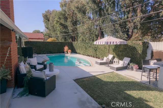 Updated single-level pool home with a private manicured backyard. This three-bedroom two, two-bathroom home is warm, inviting, and filled with designed touches. Natural hardwood floors flow throughout the house. Beautiful double French doors open onto the entertainers' backyard with a pool and built-in BBQ with bar seating. Upgraded kitchen with granite counters, gas range, refrigerator, and wine refrigerator. Ceiling fans in each bedroom. The garage has been updated with epoxy flooring and new storage cabinets and can be used as additional office space. The cozy living room is complete with a wood-burning fireplace. The back gate opens onto a tree-lined park with walking trails and a playground. The owner pays for pool and gardening services.