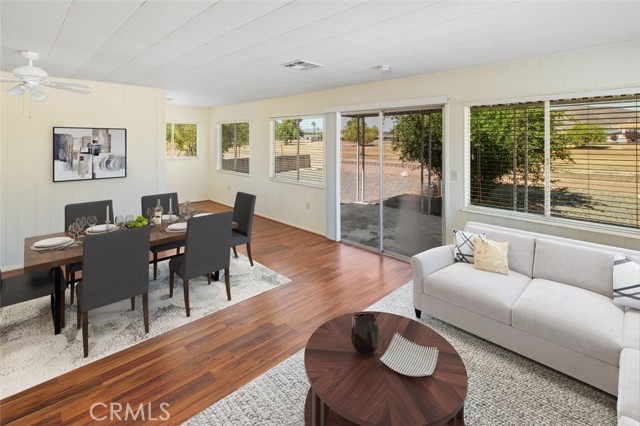 This home is a stand-out. Great curb appeal. Charming and spacious. Thoughtfully updated and well-maintained. Immaculate. A friendly open-feel floor plan with plenty of natural light and peaceful views. This two bedroom, two bath, plus expansive bonus room boasts many upgraded features such as a stylish renovated kitchen, newer roof and newer HVAC, new cooktop and range hood and new exterior paint. Other pleasures include a roomy en-suite step-in shower, cozy bath tub, ceiling fans through-out, wood faux blinds, gorgeous laminate and tile flooring in the main rooms, and plush new carpet in the bedrooms. The large bonus room is for you to decide - a dining room, den, office, hobby, recreation or family room – your choice. No immediate rear neighbors! The living room spills into the panoramic views of the bonus room which opens lavishly to the covered patio and reveals a wildlife enclave – a swath of the great outdoors – the park-like greenbelt. Enjoy the rolling hills backdrop and picturesque beauty from a drought-tolerant, low maintenance yard shaded by mature fruit trees: orange, lemon, grapefruit and pomegranate. Conveniently close to restaurants, shops, services, transportation and the 215 freeway. The 55+ community of the Sun City Civic Association offers a low annual HOA fee, two sparkling swimming pools, a large spa, well-equipped gym, pickle ball court, multi-tabled billiards room, wood shop machinery, classes, social opportunities, activities, an amphitheater and more! Some photos include the use of virtual furniture to aid in viewer's understanding of the space.