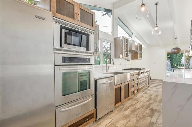 Come check out this thoughtfully designed home with 5 bedrooms, 3 baths, and a next-gen suite ideally located in Woodland Hills, ready for your love! This newly renovated modern stunner features luxe finishes and upgrades perfect for a family who loves entertaining! The brand-new, never used, upgraded kitchen features white marble countertops that beautifully complement the organic wood tones of the cabinets. Heaps of natural light graze through your space, making it feel fresh and vibrant while highlighting the bright wooden beam ceilings! Pop open a bottle of wine from your wine fridge and step outside to a large backyard complete with a built-in BBQ, fireplace, and a sparkling pool/spa! Convenient features include centralized air conditioning, heat, and a thermostat, as well as in-unit laundry facilities. It has four carport parking spaces for cars and automatic sprinklers on the lawn to keep your grass green year-round! This home is conveniently located 2 minutes away from the Victory + Tampa Shopping Center and 5 minutes away from the 101 Freeway. Very spacious ADU is included in rent and comes with its own living/family room!