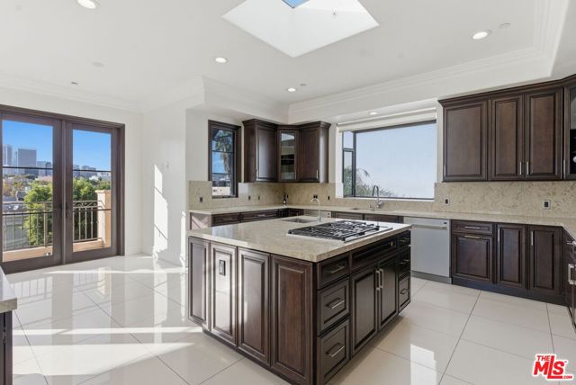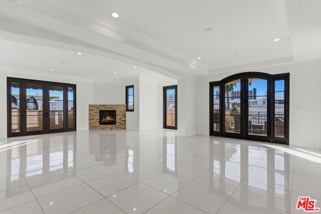 Presenting a rare, top-floor penthouse residence located in the esteemed Beverly Hills. Occupying the entirety of the building's top level, the private elevator opens directly into the unit, offering unparalleled privacy and convenience. Upon entry, an expansive open-concept living area is illuminated by abundant natural light streaming through large windows and elegant French doors. Pristine white tile flooring extends throughout the home, creating a bright and sophisticated ambiance. The living and family rooms seamlessly connect to a state-of-the-art kitchen, equipped with premium stainless steel appliances and a central island with integrated stovetop and oven, ideal for culinary excellence and entertaining guests. The private hallway leads to an impressive primary suite featuring a spacious bedroom, two oversized walk-in closets, and a beautifully appointed split bathroom designed for maximum comfort and privacy. Three additional guest bedrooms, a refined powder room, and a dedicated in-unit laundry room further enhance the residence. Enjoy sweeping city views throughout almost every window and balcony. Residents will appreciate convenient access to renowned shops, upscale dining, and premier attractions in the heart of Beverly Hills.