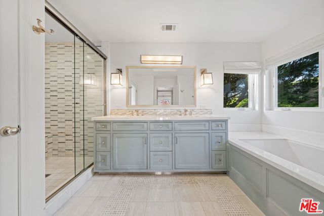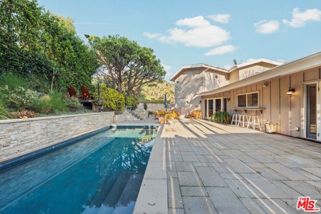 Located in the Marquez Knolls, this coastal modern farmhouse blends the warmth of East Coast Cape Cod style with the relaxed sophistication of California living. A spacious open concept living room and dining room flow seamlessly together, creating an inviting atmosphere for both everyday living and entertaining. The living room features a cozy fireplace and abundant natural light, while the dining room connects effortlessly to the kitchen and offers direct access to the entertainer's backyard. The kitchen is generously sized and updated with stainless steel appliances, custom cabinetry, quartz countertops, countertop seating, and a farmhouse sink. Adjacent to the kitchen is an additional living room or casual family room complete with a built in media cabinet, providing a comfortable secondary space for relaxation. The primary suite is expansive and includes its own private balcony with views of the lush hillside. The spa like bathroom features dual sinks, a separate tub, and a large shower. Three additional bedrooms and two additional full bathrooms complete the interior layout.Outside, the property truly shines with a large patio area, a fenced in yard offering privacy, mature landscaping, and a spacious pool and spa. This home offers the ideal blend of style, comfort, and coastal living in one of the Palisades most desirable neighborhoods.