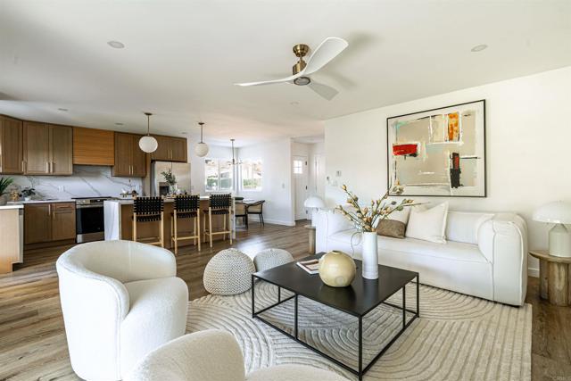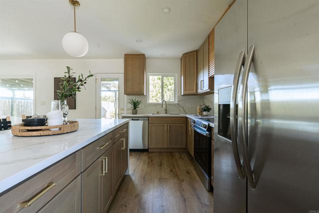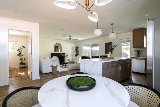 Discover this beautifully reimagined La Mesa home tucked away at the end of a peaceful cul-de-sac in a highly sought-after, established neighborhood. Thoughtful renovations blend timeless design with modern ease, creating a bright, open interior filled with natural light. Luxury vinyl plank flooring, quartz countertops, and stylish contemporary fixtures deliver an elevated yet comfortable living experience. The chef-inspired kitchen features sleek cabinetry, stainless steel appliances, and a generous center island- perfect for cooking, casual meals, and hosting friends. The primary suite offers a calm retreat with an ensuite bath and views of the lush, private backyard. Step outdoors to a newly landscaped yard ideal for al fresco dining, gardening, or simply enjoying the San Diego sunshine. Moments from Lake Murray, Cowles Mountain, and Mission Trails, this home pairs outdoor adventure with commuter-friendly access to major highways. Embrace the best of the La Mesa lifestyle!