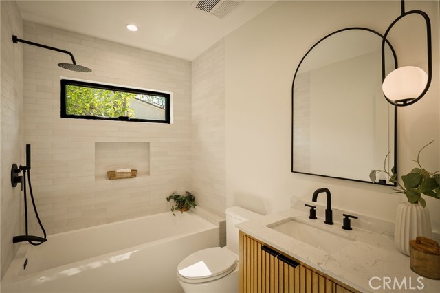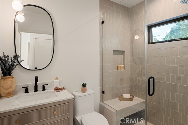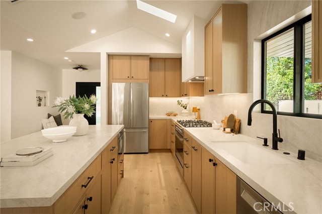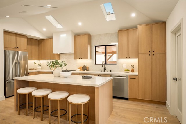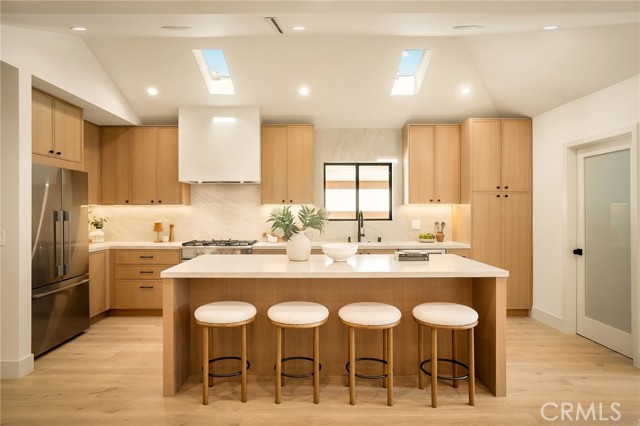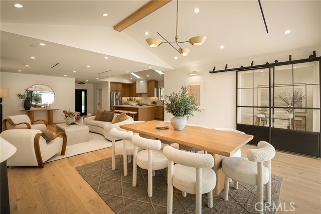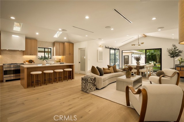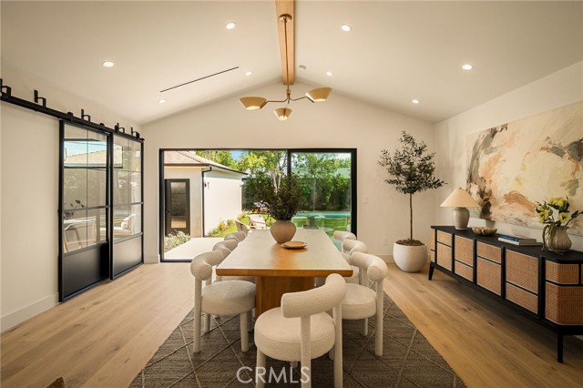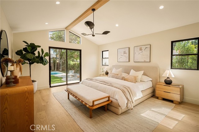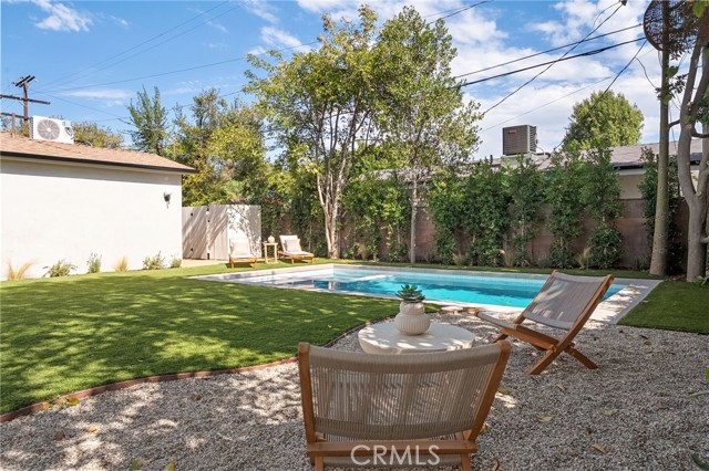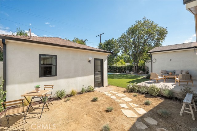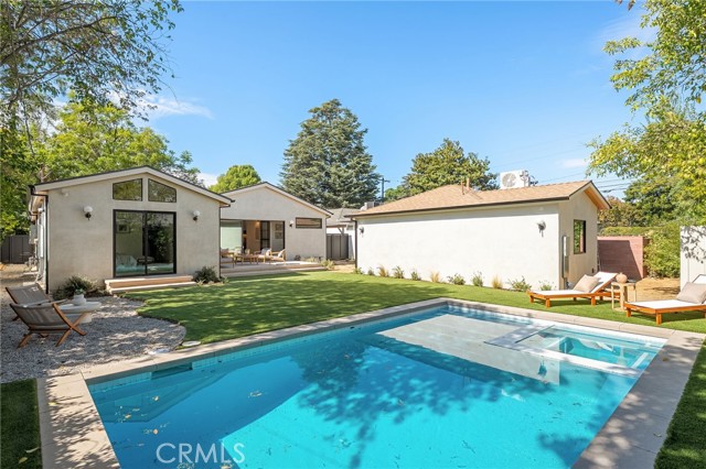 This beautifully reimagined home sits gracefully on a quiet street in one of Valley Village’s most desirable neighborhoods. Thoughtfully redesigned from top to bottom, the 3-bedroom, 2.5-bath residence showcases sophisticated design, natural light, and seamless flow throughout its open-concept layout. The inviting living room, anchored by a cozy fireplace, connects effortlessly to the dining area and a chef’s kitchen featuring a large island, custom White Oak cabinetry, Taj Mahal quartzite countertops, and premium appliances — the perfect setup for gatherings and everyday living. Sliding doors open to a spacious entertainer’s backyard featuring a brand-new pool and spa, surrounded by lush greenery and ambient landscape lighting that create a private, resort-like retreat. The primary suite offers direct access to the backyard and a spa-inspired bath with a freestanding soaking tub. Each bedroom is spacious and filled with natural light, offering comfort and versatility for family, guests, or creative use. The home also features a dedicated laundry room with ample storage, carport parking, and a detached 1-bedroom ADU showcasing high ceilings and abundant natural light.. The property’s extended driveway provides generous parking for several vehicles, including space for an RV. Set on an expansive 8,100 sq. ft. lot, this 2,600 sq. ft. property blends modern luxury with timeless warmth, offering exceptional design and functionality in one of Valley Village’s most desirable neighborhoods — just moments from a House of Worship.
