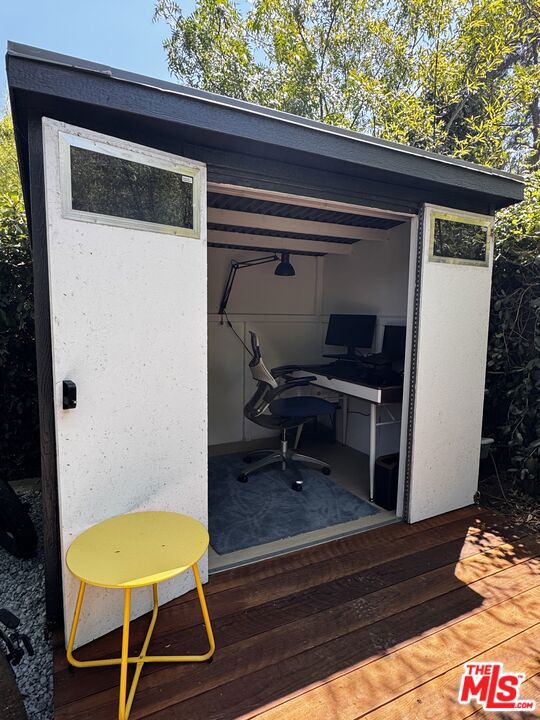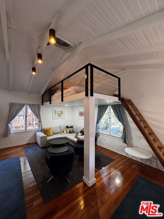Stylish Silver Lake Rear Loft Home with Private Outdoor Spaces, Detached Office & EV Charger 2449 Riverside Place, offered furnished for lease set at the back of a duplex lot on a quiet cul-de-sac in one of Silver Lake's most charming enclaves, this beautifully furnished loft residence offers a rare combination of privacy, creative flexibility, and lush outdoor living.Inside, vaulted open-beam ceilings and rich hardwood floors create a light-filled, airy ambiance. The living room is anchored by a spacious lounge area, seamlessly connected to a lofted sleeping space featuring a king-size Tuft & Needle mattress for the perfect night's rest. The modern kitchen boasts sleek cabinetry, quartz countertops, stainless steel appliances, and a sunny breakfast nook with built-in desk space. A walk-in closet provides ample storage with both open shelving and enclosed wardrobe systems.The bathroom is fresh and bright with designer tile, a walk-in shower, and a window framing the garden beyond.Step outside and you'll find multiple private spaces to relax or entertain: a landscaped backyard with lounge seating, a shady deck under mature trees, and a brick pathway leading to a detached office/studio perfect for remote work, art, or reading.The property backs directly onto the historic Corralitas Red Car Trail, where you'll find a large parking pad with space for multiple vehicles and direct gated access into the backyard. A Level 1 EV charger is also included, making it convenient for electric vehicle owners. Located moments from Silver Lake's best coffee shops, dining, and boutiques, with easy access to Griffith Park, the LA River bike path, and Downtown LA. Follow the directions on the attached link to arrive at the property. https://goo.gl/maps/Jeah9wUGZUTvxEYZ8