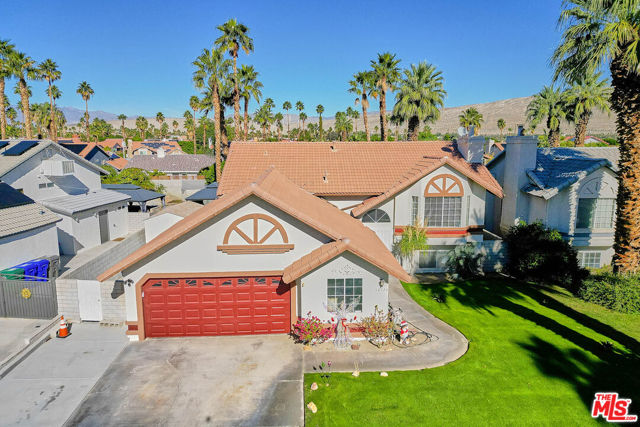 Nestled on Minerva Road in the heart of Cathedral City, this split-level home offers a comfortable and inviting living space. With a south-facing orientation and functional floor plan, the home features 4 bedrooms, 3 bathrooms, and a versatile bonus room that can serve as an office, gym, or media room. It's ideal for multigenerational households seeking flexible living options. The bonus room can serve as a private suite for grandparents or adult children, or function as a home office, gym, or media room. The kitchen has granite countertops and stainless steel appliances. The adjacent dining area opens to a deck with mountain views, perfect for enjoying your morning coffee or evening cocktails. The backyard is an entertainer's dream, with a pool and Jacuzzi, a pergola for shaded outdoor dining, and established landscaping including mature orange, tangerine, and grapefruit trees. A storage shed and 2 car garage provide ample space for all your outdoor equipment and toys. Conveniently located near schools, hiking trails, golf courses, and downtown Cathedral City's shops, restaurants, and galleries. Enjoy the Coachella Valley's festivals and events, without HOA fees or leased land .This home is situated on a street known locally as "Candy Cane Lane" for its holiday light displays each December. With generous storage, flexible living spaces, and a backyard made for hosting, this property offers a fantastic opportunity for multigenerational families seeking a home in a desirable location.