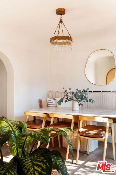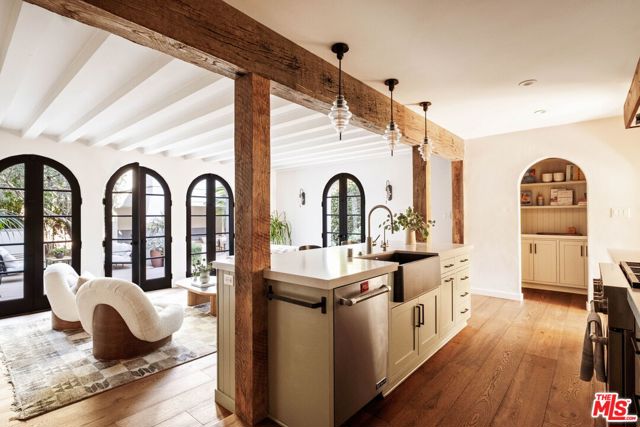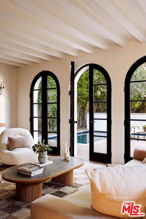 Beautifully updated Spanish home with a resort-like backyard on one of Beverly Grove's most coveted tree-lined streets. Set behind lush hedging, a gated courtyard with a tranquil fountain creates a serene sense of arrival.The sun-drenched living room with dramatic beamed ceilings, arched windows, and an original fireplace anchors the home with warmth and character. The formal dining room transitions seamlessly into a thoughtfully renovated chef's kitchen with custom cabinetry, stone counters and breakfast island, and opens to a spacious den overlooking the garden. Three bedrooms plus an office/fourth bedroom, including a peaceful primary suite, offer a thoughtful floor plan with great versatility. In the backyard, mature landscaping, an outdoor pizza oven, sparkling pool and spa, and beautifully designed pool cabana complete a private oasis with multiple spaces for lounging, dining, and entertaining. Additional highlights include updated systems, hardwood floors, curated designer finishes, and gated parking.Moments from The Grove, Beverly Center, and LA's most beloved restaurants. Available furnished $18K / month or unfurnished $15,000 / month.