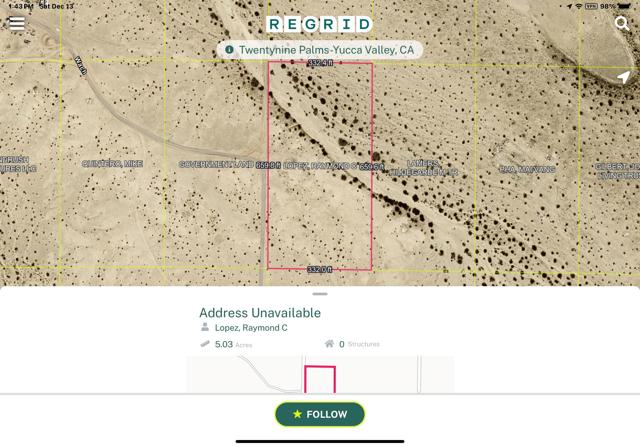 5.03 acres. Located on the South side of Amboy Road. No Water or Electricity. Priced to Sell, Now!Currently, it's the lowest priced 5 acres in Wonder Valley. Located behind (1/2 mile) or south of the Palms Cafe.