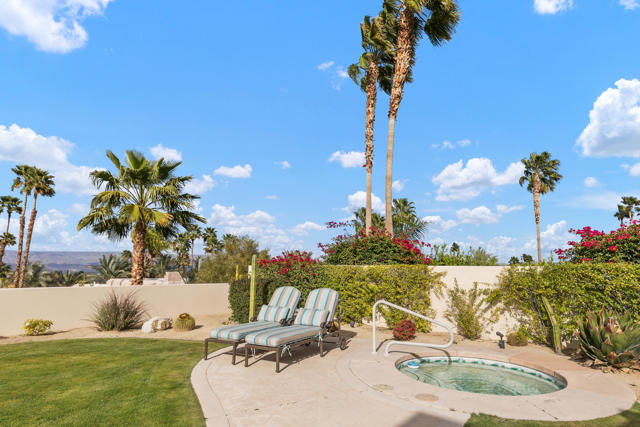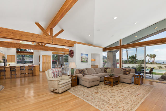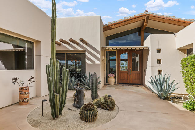 Feels Like Big Bear or Lake Tahoe--Right Here in the Desert! This distinctive custom contemporary home, nestled in the exclusive Highlands of Ironwood Country Club, offers a rare mountain-lodge ambiance combined with resort-style desert living. From the moment you pass through the private gated courtyard and step through striking double wood-and-glass doors, the essence of this home unfolds. Inside, soaring ceilings, exposed beams, and expansive windows flood the space with natural light and frame breathtaking views. The open floor plan features 4 bedrooms and 4.5 baths, including a generously sized primary suite with stunning vistas, a private office, a spacious walk-in closet, and a luxurious bathroom with a wall of built-in cabinetry. Set on nearly half an acre, the elevated backyard is an entertainer's dream--complete with a newly built outdoor kitchen, ample seating areas, lush green space, and a 50-foot pool with a separate spa. Enjoy panoramic mountain views and the sparkling lights of the valley at night. This exceptional property combines privacy, sophistication, and a unique sense of escape. A must-see!Ironwood Country Club is a private club with two 18-hole golf courses, fitness center, tennis and pickle ball courts, and a beautiful clubhouse. Membership is by application and requires sponsorship.