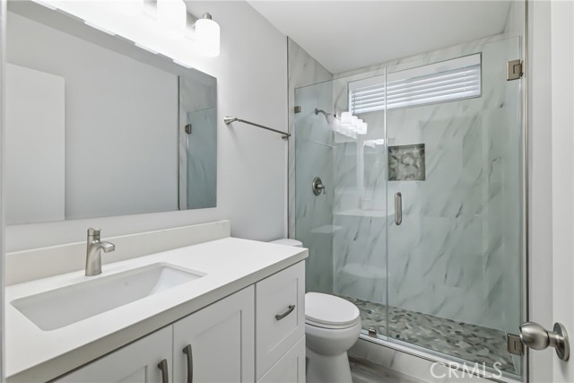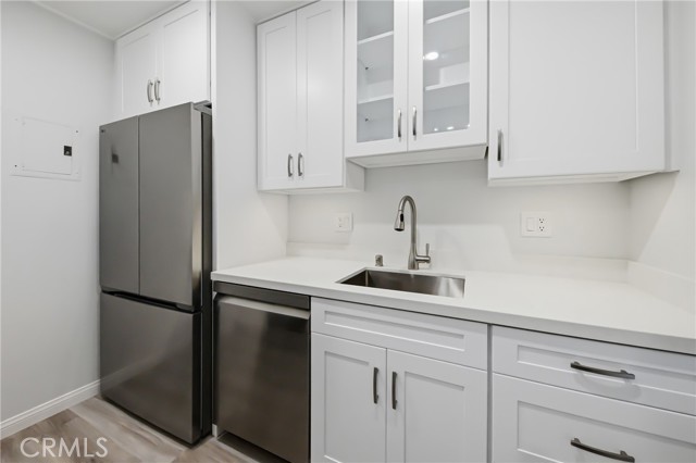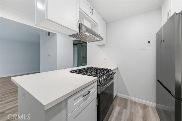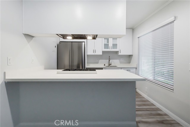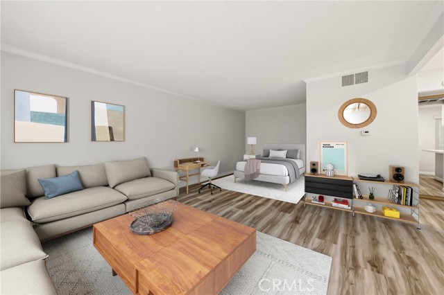 Spacious, fully updated studio condo located in the desirable Cabrillo Park community. This bright lower-level unit features beautiful wood floors, brand-new double-pane windows with new blinds, and a modern, open layout. The remodeled kitchen offers stainless steel appliances, brand-new quartz countertops, shaker-style cabinetry, a new range, and a new sink. Fresh interior paint and a new front door create a crisp, move-in-ready feel. The bathroom has been upgraded with a new walk-in shower and modern vanity. Enjoy easy access with no stairs or steps, one assigned carport parking space, and community amenities including a swimming pool, spa, on-site laundry facility, and fitness room. The beautifully maintained grounds feature mature trees, flowing water ponds, and lush natural landscaping, creating a peaceful, park-like setting.