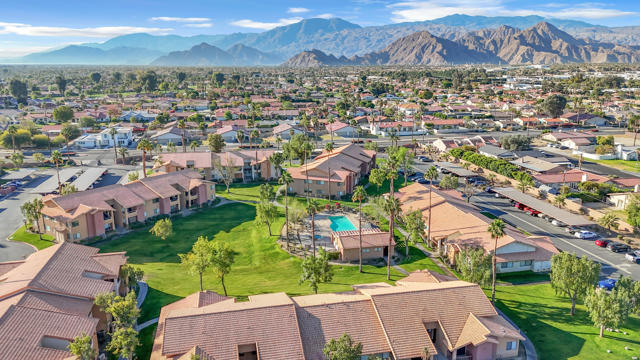 Offered turnkey furnished with low HOA's, welcome to this beautifully renovated 1 bedroom, 1 bath condo nestled in the desirable gated community of Saddleback. Offering approximately 760 sq. ft. of thoughtfully designed living space, this home features soaring vaulted ceilings that enhance the open, airy feel, along with a private balcony showcasing breathtaking views of the San Jacinto Mountains and lush green hills, no parking lot views here! Whether you're looking for your first home, a desert getaway, or a savvy investment property, this condo truly checks all the boxes. Recent upgrades include luxury vinyl plank flooring with extra soundproof underlay, new energy efficient windows, and Mediterranean style tile flooring in the bathroom and laundry room. The stylish bathroom features a dual vanity, a resurfaced tub, and classic subway tile for a clean, timeless look. The modern kitchen showcases shaker style cabinetry, quartz countertops, a subway tile backsplash, and elegant brass fixtures, perfect for entertaining or enjoying quiet mornings. An upgraded light fixture in the dining area adds just the right touch of sophistication. Saddleback offers resort-style amenities including four pools, a fitness center, a clubhouse, and three tennis courts, all just minutes from the world-famous Indian Wells Tennis Garden, top-rated golf courses, and some of the best shopping, dining, and entertainment in the Coachella Valley.Whether you plan to live in it full-time, rent it seasonally, or hold it as a long-term investment, this rare gem is truly move-in ready and full of potential. Schedule your private showing today and start living the desert lifestyle.