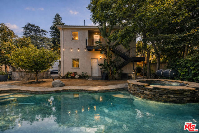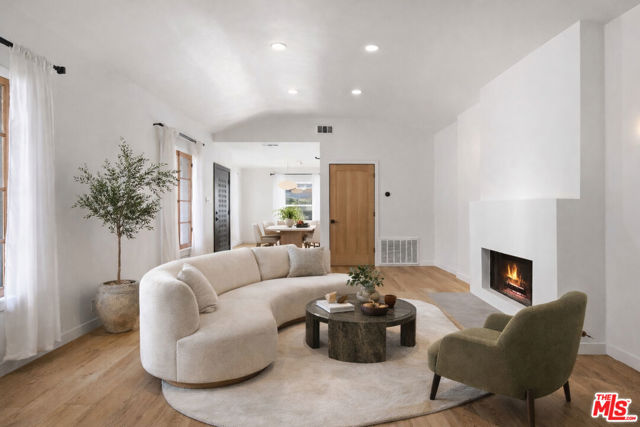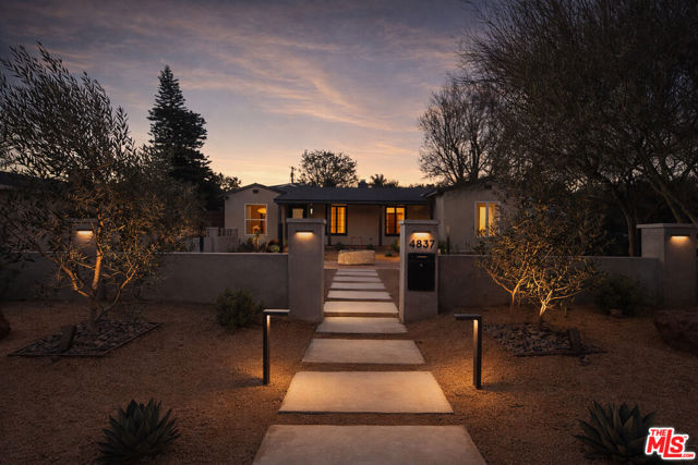 Presenting The Gentry House a fully renovated, private modern ranch compound offering serene indoor, outdoor living in the heart of Valley Village. Thoughtfully reimagined with an emphasis on light, privacy, and flow, the property includes exclusive use of a resort-style pool, a detached guest residence (ADU), and beautifully curated grounds designed for elevated everyday living. Natural light fills the interiors, enhanced by vaulted ceilings that create an open, airy atmosphere throughout. Outdoors, sculptural succulents, a stone water fountain, and a fire pit establish a tranquil, resort-like setting, seamlessly extending the living experience beyond the home.Inside, wide-plank hardwood flooring runs throughout, complemented by recessed lighting, a custom fireplace, and high-end designer finishes. Carefully selected lighting fixtures and architectural details reflect a refined, contemporary sensibility. The kitchen is both sophisticated and functional, featuring custom olive-green cabinetry, stainless steel appliances, a six-burner range, floating shelving, a farmhouse sink, and a thoughtful mix of butcher block and quartz countertops. Both the main residence and the guest house are equipped with in-unit washer and dryer, offering ease and flexibility across the property. Designed for modern living, the home also features a smart thermostat and ample on-site parking are amenities that further enhance comfort and convenience. Outdoors, the private backyard is ideal for entertaining or quiet retreat, complete with a BBQ area, outdoor dining space, and effortless indoor/ outdoor flow perfect for hosting, relaxing, or enjoying evenings under the stars. The Gentry House is a rare Valley Village offering: a fully private, design-forward compound where modern ranch architecture meets serene California living.