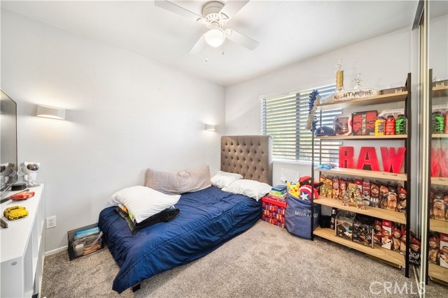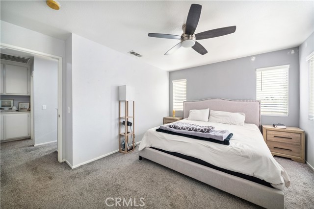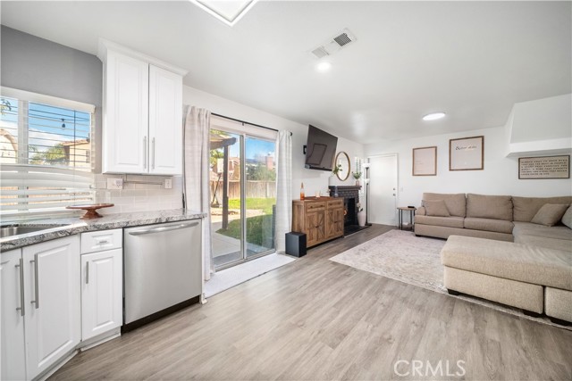 Situated in a quiet Moreno Valley cul-de-sac, this 2000-built home maximizes function and flow. The standout layout features two distinct living areas: a tiled front lounge perfect for a media room or office, and a separate family room anchored by a black brick gas fireplace and wood-style flooring. The bright kitchen is updated with granite countertops, stainless steel appliances, white cabinetry, and dual skylights that flood the space with natural light. Upstairs, the primary suite offers a private retreat with a walk-in closet and en-suite bath. Outside, the 6,098 sq. ft. lot shines with a lush green lawn, low-maintenance vinyl fencing, and a dedicated fire pit area. The included backyard gazebo creates an instant outdoor dining room. Complete with a leased solar system for energy efficiency, this home is move-in ready.