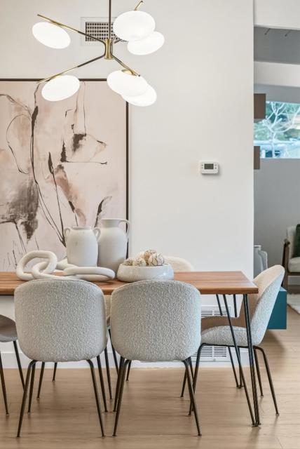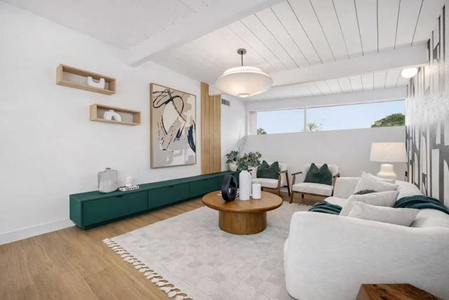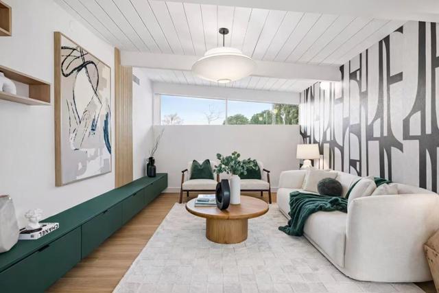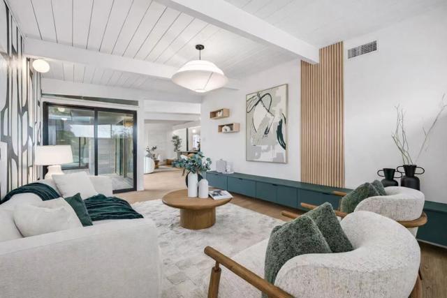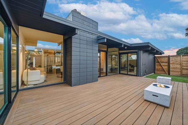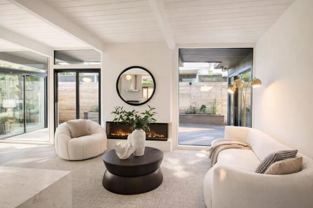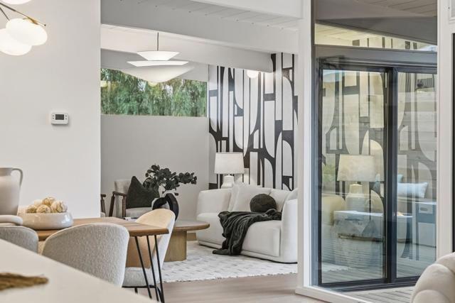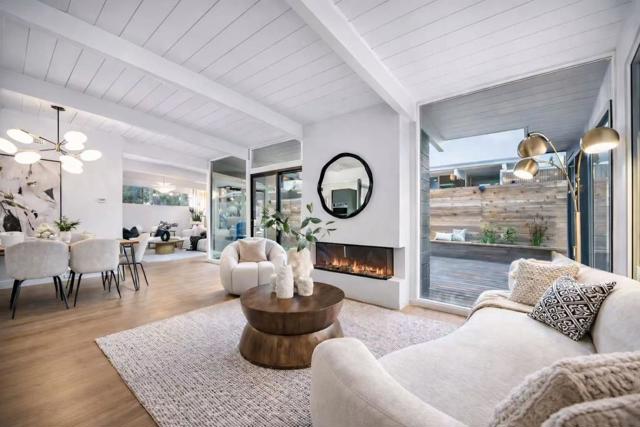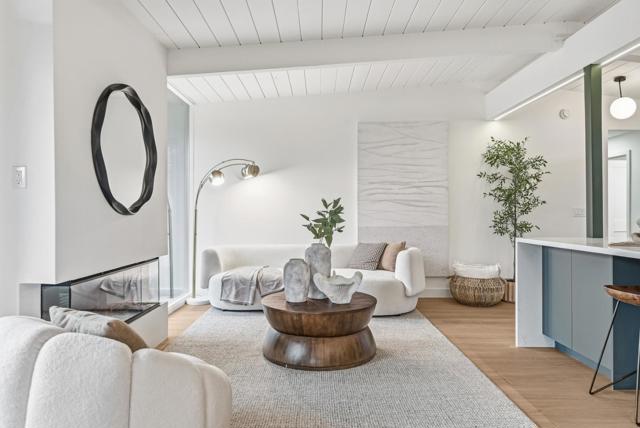 Welcome to the beautifully reimagined Eichler home that honors its iconic mid-century modern design while offering a fully turnkey, contemporary living experience. It features classic post-and-beam ceilings, crisp white paneling, expansive walls of glass, and abundant natural light. The open-concept living and dining areas feature wide-plank flooring, designer lighting, custom millwork. The brand-new chefs kitchen is showcasing custom two-tone cabinetry, quartz countertops, tile backsplash, high-end SS appliances, waterfall island. The adjacent living area is anchored by a sleek modern fireplace, creating a warm and stylish focal point. The private living quarters include spacious bedrooms and a fully renovated primary suite with a spa-inspired bathroom featuring a custom vanity, designer tile, and contemporary fixtures. Additional bathrooms have also been updated. Sliding doors open to a redesigned backyard with low-maintenance artificial turf, outdoor fireplace, integrated lighting. Additional highlights include fresh interior and exterior paint, new HVAC systems, and two-car garage. Conveniently located near downtown San Mateo, shopping, dining, parks, Caltrain, and major commute routes. This home offers architectural significance, modern luxury, and prime Peninsula living.