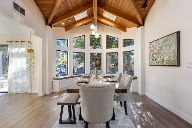 This uniquely charming 4-bed, 2-bath single-story home blends architectural character, comfort, and future flexibility. The striking light filled dining room framed by tall expansive windows, flood the space with beautiful light. Built-in window seating creates a special gathering spot and additional storage. Wood ceilings with exposed beams add warmth and craftsmanship that gives the home a truly unique personality. The functional layout includes an updated kitchen with white shaker cabinetry, granite countertops, and water filtration. The primary bathroom has been newly remodeled, with brand-new LVP flooring throughout the home and primary bedroom, and new carpet in the secondary bedrooms. A sunroom off the primary suite offers an ideal space for a home office or quiet retreat. Set on a generously sized lot, the backyard is a true lifestyle feature with a vegetable garden, chicken coop, and mature fruit trees, including peach, apple, pear, and cherry plum. There is excellent potential to add an ADU, making it ideal for multi-generational living, rental income, or future expansion. Located in the desirable Granada Hills neighborhood near Benicia, parks, trails, Blue Rock Springs Golf Course, Vallejo-SF Ferry and major freeways.