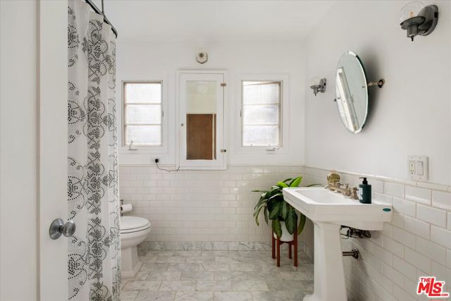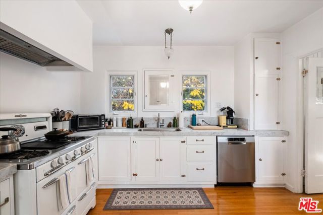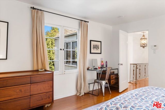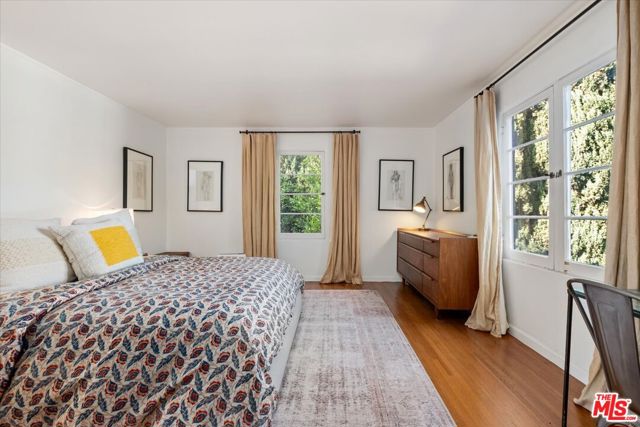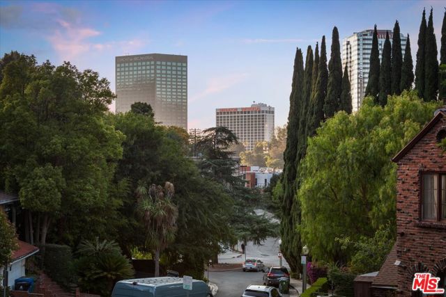 Nestled in the Hollywood Hills just south of Cahuenga Blvd, this Normandy-inspired home exudes the timeless glamour of Golden Age Hollywood. Inside, signature architectural details meet a thoughtful floor plan designed for both intimate evenings and grand entertaining. The inviting living room, anchored by a classic fireplace, flows effortlessly into a step-down formal dining room and an adjacent butler's pantry. For those who love the California lifestyle, a spacious patio off the dining room offers a seamless indoor-outdoor transition for al fresco meals. The kitchen is a blend of charm and utility, featuring a farmhouse sink, cozy banquet seating, and ample cabinetry. Upstairs, two serene bedrooms overlook the lush, tree-lined vistas of Universal City, while a sun-drenched office/studio boasts renovated flooring. Character details abound, from original hardwood floors to vintage light fixtures. The tranquil backyard serves as a private sanctuary with multiple patio areas and two storage units. There is additional storage in the garage along with an EV charger. Ideally located minutes from major studios, Universal CityWalk, Hollywood and the vibrant shopping districts of Studio City and NoHo.