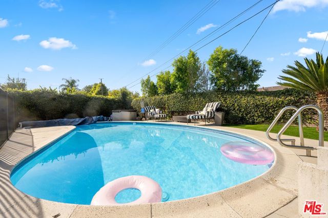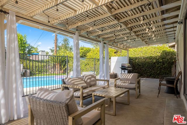 Welcome to this beautifully updated single-level Valley Glen home offering comfort, style, and effortless indoor-outdoor living. Set behind a gated front yard with generous parking, the home also features an attached garage and a thoughtfully designed floor plan with four bedrooms and three bathrooms. Inside, a spacious living room flows seamlessly into a separate dining area, while the eat-in kitchen has been updated with newer stainless steel appliances, refreshed finishes, and direct access to a dedicated laundry room. Remodeled bathrooms, freshly painted interiors, and refinished floors complete the interior. Sliding doors from the living room open to a large pergola-covered outdoor entertaining area. Beyond the pergola, the backyard features a gated pool and a separate Jacuzzi, creating a relaxed setting ideal for everyday enjoyment or hosting. The home may be offered furnished or unfurnished for added flexibility. Conveniently located near NoHo West, houses of worship, Valley College, and with easy access to the 170 and 101 freeways, this home offers turnkey living in a prime location.