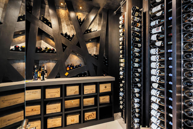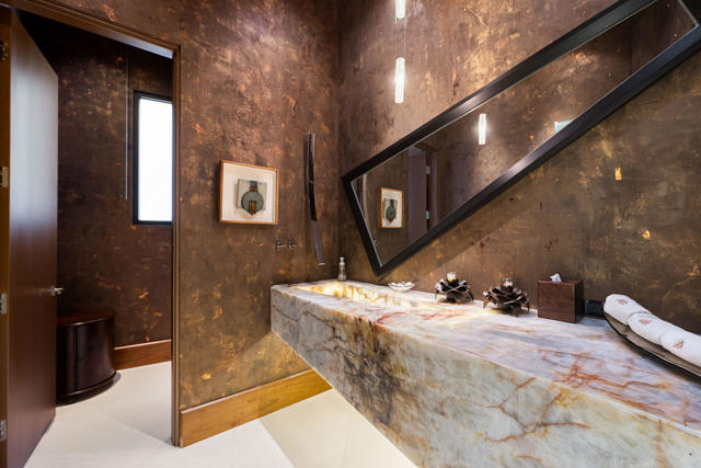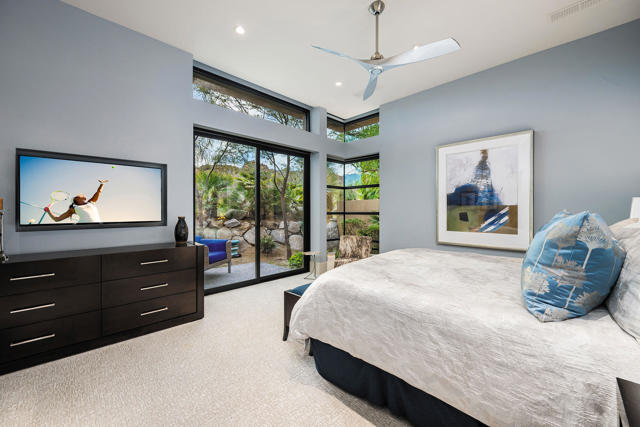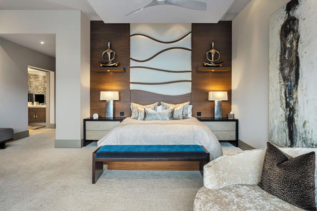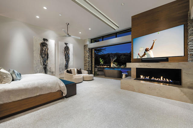 An exceptional estate that offers the best of desert living where entertaining without boundaries is just the start. A home where walls disappear providing a front row seat to breathtaking southern unobstructed views of the lake, golf course and mountains beyond. This property is designed for both leisure and lifestyle with exciting amenities including a rare 6 car plus golf cart bay with a private gated motor court which is just the introduction to all that awaits. The private courtyard with quiet water features and landscape lead you to the glass door entrance and from there you experience contemporary architecture that blends with refined, warm, livable, luxury. The attention to detail has created a private resort-style retreat designed for both entertaining and intimate everyday living. The great room opens seamlessly to the outdoors through walls of electronic pocket sliders, creating an invisible boundary between inside and out. Dual fireplaces, media, and sit down wet bar create the ultimate indoor/outdoor gathering space. A dramatic temperature-controlled wine display adds another custom feature. The primary retreat is a true sanctuary with pocketing floor to ceiling glass sliders, media and intimate fireplace; and also features a spa-inspired bath with his and her private lavs and generous closets, a slider off the stand alone tub providing serene connection to surrounding landscape. A separate office area with custom built-in shelving, and murphy bed. Four en suite bedrooms, including an attached guest house with two suites, a living room, breakfast bar and secluded spa grotto; two additional suites provide beautifully appointed comfort and privacy. At the heart of the home, the gourmet kitchen offers premium appliances, an oversized island, butler's pantry, and a sunlit morning room with pocket sliders opening to the landscaping of the courtyard. Enjoy the outdoors with multiple outdoor entertaining areas including pool, spa, BBQ, firepits, and lounge areas all while enjoying surrounding nature and tranquil views. The warm contemporary finishes with wood details, natural stone, and curated textures throughout the home, all create a timeless yet modern aesthetic that feels both sophisticated and inviting. Owned solar. This is desert luxury reimagined...elegant, effortless, and unforgettable.