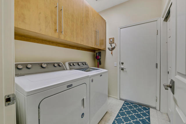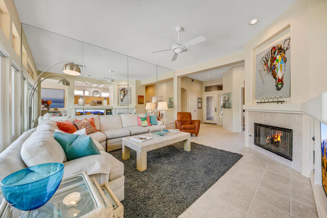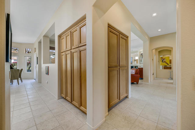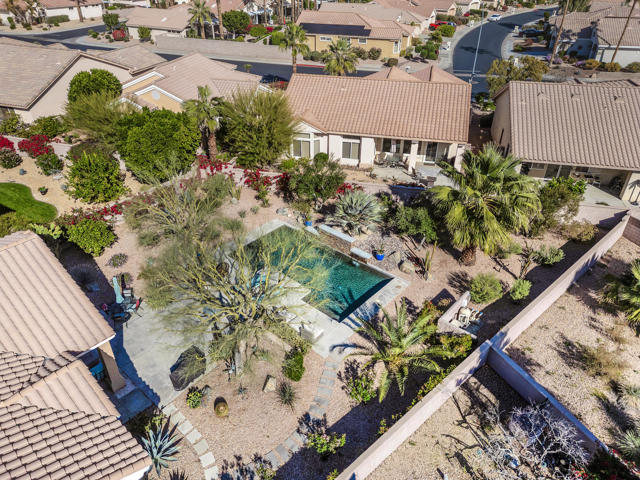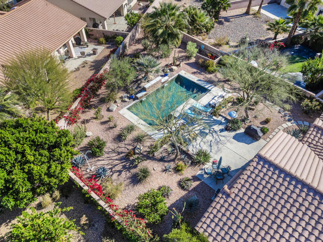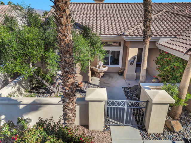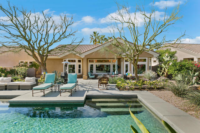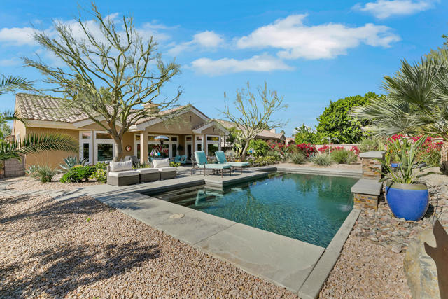 Set on an oversized lot nearly 11,000 sf this beautifully curated Marrakech floorplan offers exceptional privacy, space, & refined desert living, an opportunity rarely found within Sun City Palm Desert. Featuring 2 bedrooms, + Den, & 2 baths, thoughtfully designed for both comfort and versatility. Offered furnished with some exclusions at no additional value, making it ideal as a full time or seasonal home. A gated front courtyard with a tranquil water fountain sets an elegant & serene tone upon arrival. Through the glass front door, the home opens to a bright & inviting living room highlighted by a fireplace, custom built-in entertainment center, & expansive picture windows showcasing sweeping backyard views. Transom windows fill the main living space with natural light, enhancing the home's airy ambiance, while tile flooring throughout provides timeless style & continuity. The living area flows seamlessly into the kitchen, creating a sophisticated great-room experience ideal for everyday living and entertaining. The adjacent dining area enjoys picturesque backyard views, while the kitchen features a breakfast bar, stainless steel appliances, & generous counter space. The primary suite is privately situated in its own wing, offering a peaceful retreat separate from guest accommodations. It features unobstructed backyard views from a bay window & a private ensuite bathroom with dual sinks, a spacious shower, & a walk-in closet with organizers. The guest bedroom and bath are located on the opposite side of the home, ensuring comfort and privacy for visitors. A versatile den or flex space opens to the main living area and may serve as an office, media room, or additional sleeping area. Designed for resort-style enjoyment, the enclosed backyard showcases a Pebble-Tec pool with cascading water feature, multiple patio areas for entertaining, and lush desert landscaping. The rare lot size and ideal sun orientation create a tranquil and highly usable outdoor environment. Additional features include an interior laundry room with newer washer and dryer, a two-car garage with storage, and numerous improvements over time including exterior paint & weep screed, updated kitchen appliances, upgraded windows (excluding transoms), renovated irrigation, a refurbished courtyard fountain, and pool system updates. With its expansive lot, thoughtful layout, and refined upgrades, this home offers a rare blend of luxury, privacy, and value. A truly special opportunity