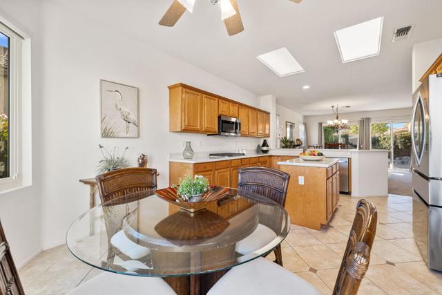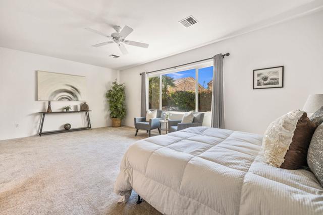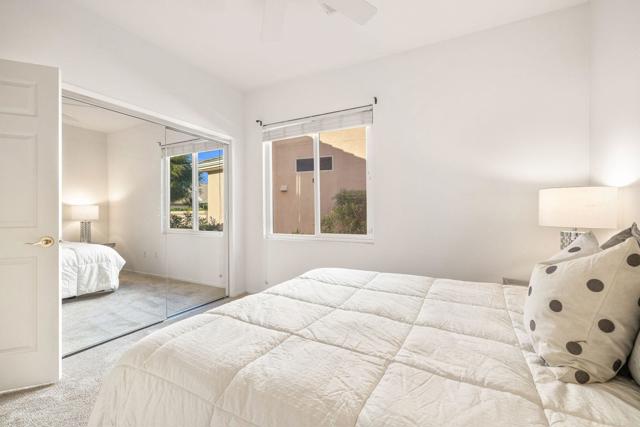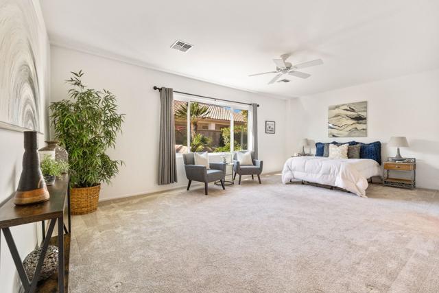 This very popular St. Croix model has an open concept, with 2 bedrooms, 2 bathrooms, and a den/office. There is a hobby room, accessed by the garage, once used as a photography darkroom. It has cabinets, counter space, and a sink. Newer paint, carpet, and vinyl windows throughout the home. The kitchen has new stainless appliances, beautifully refinished Corian countertops, a breakfast nook, a prep island, a bar counter, and opens to the dining and living rooms. The light, bright living room has large picture windows and a slider that opens to the private south-facing backyard and the relaxing waterfall fountain. The den/office opens to the living area and is perfect for a game room. The large master suite views out to the patio and the beautiful waterfall feature. It has marble floors, a double vanity, a walk-in shower, a large walk-in closet, and a private toilet room. The guest bedroom is adjacent to the 2nd full bathroom, has marble floors, and is very inviting. The laundry room has marble floors, cabinets for storage, and includes the washer and dryer. The 2-car garage has cabinets and a golf cart garage. Some furnishings are available outside of escrow, excluding the current staging furnishings. Come see this fabulous home.