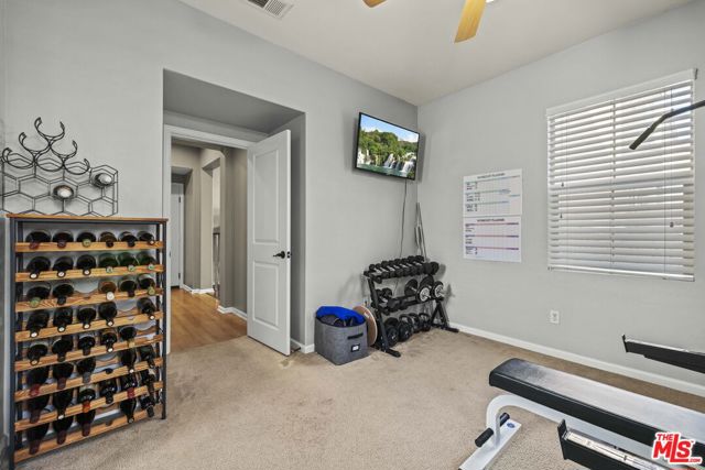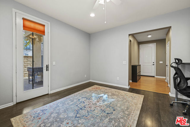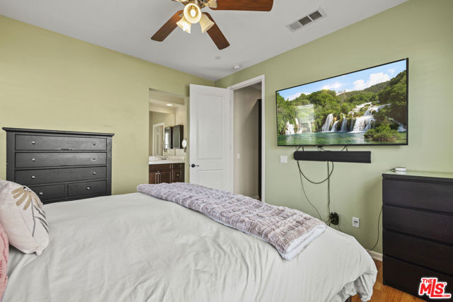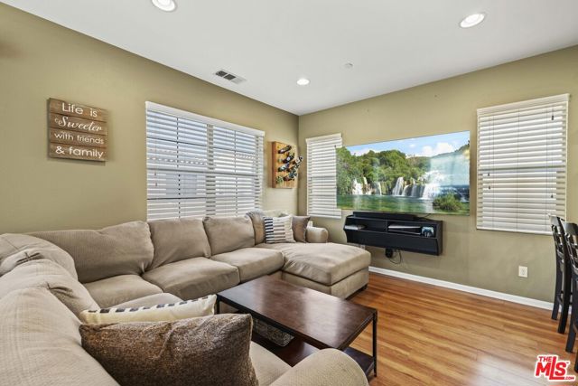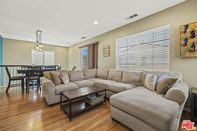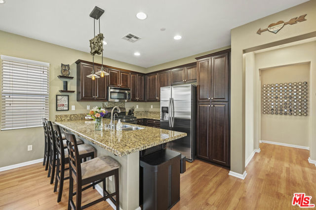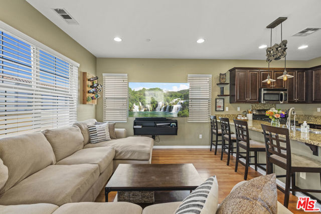 Gorgeous 2-story home in the desirable Villa Metro community. This thoughtfully designed floor plan features a first-floor bedroom and full bath, plus a den/officeideal for guests or flexible living.The second level offers an open-concept family room, dining area, and beautifully upgraded kitchen with granite countertops, stainless steel appliances, dark wood cabinetry, and breakfast bar. The bright primary suite includes an attached bath with dual sinks. Additional features include a 2-car attached garage, laundry area, and a mix of carpet and hardwood flooring throughout. Prime Saugus location close to shopping, dining, and commuter access. HOA $332.38/ Month MelloRoos $1,769/ Annually