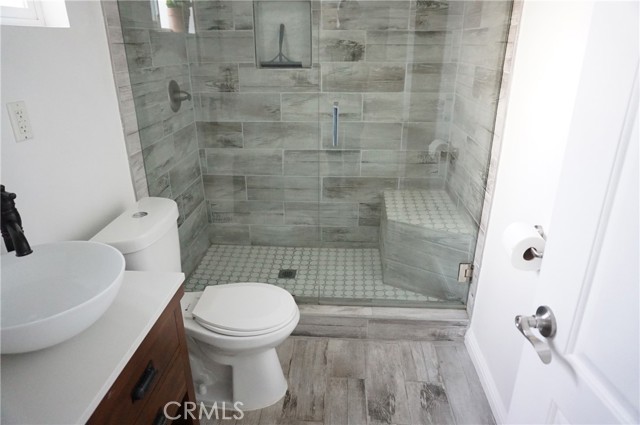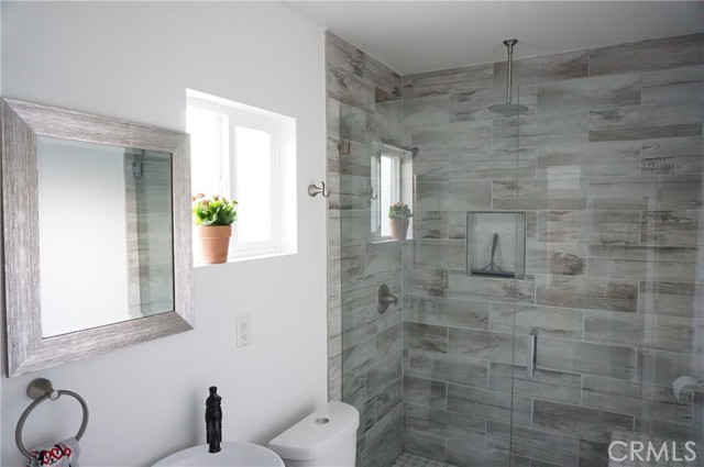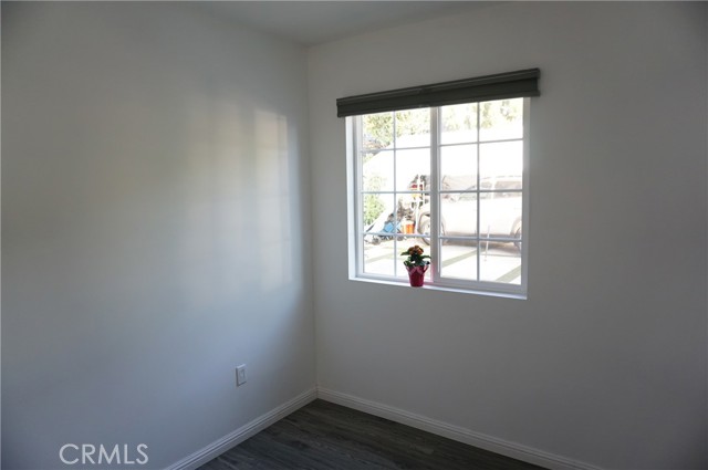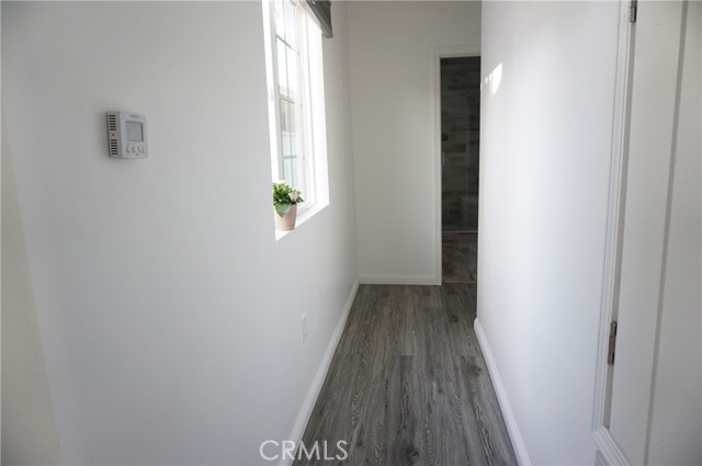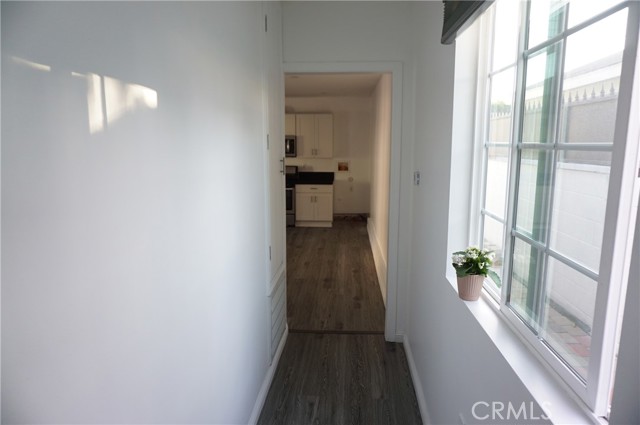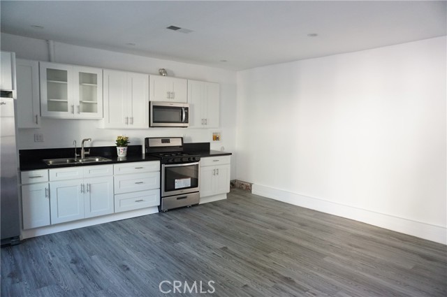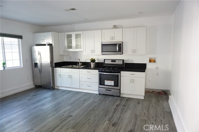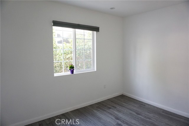 Charming rear ADU/guest house with a private, gated entrance. This well-designed 2-bedroom, 1-bath residence offers approximately 705 sq ft of living space and an open-concept floor plan. Features include engineered flooring throughout, a spacious kitchen with white cabinetry, stainless-steel appliances, recessed LED lighting, and dual-pane windows with custom blinds. The home is equipped with a newer HVAC system and convenient indoor stackable laundry hookups. The bathroom is generously sized and showcases custom tile work along with a spa-like feel, featuring a luxurious dual rain shower system. Separate electrical and gas meters. Wi-Fi is included in the rent. Street parking only. Sorry no pets!
