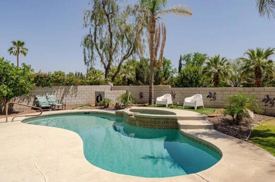Available May 1, 2026. Fully furnished and beautifully remodeled, this stunning two-story, four-bedroom, three-bath home is perfectly situated in the heart of Palm Desert, providing easy access to all areas of the Coachella Valley. Inside, you'll find elegant porcelain tile flooring, a cozy fireplace in the main living space, recessed lighting, and an open layout designed for comfort and style.The chef's kitchen is a highlight, featuring quartz countertops, a double waterfall peninsula, custom cabinetry, stainless steel appliances, and a stylish wet bar--perfect for entertaining guests. Step outside to the backyard, where breathtaking views and a resort-style pool and spa create the ideal indoor-outdoor lifestyle.On the main level, there's a guest bedroom and a dedicated laundry room. Upstairs, discover three additional bedrooms, including the primary suite with a private balcony overlooking the pool, a luxurious walk-in closet, and a spa-like bathroom with a custom-tiled shower and soaking tub.The home also includes owned solar panels, offering significant utility savings. The owners take care of pool service, landscape maintenance, and cleaning, making this a truly hassle-free living experience. Whether you're relocating to the desert or seeking a high-quality, long-term residence in central Palm Desert, this property is an exceptional opportunity to enjoy luxurious desert living.
