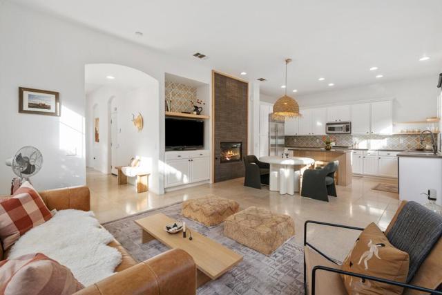 Stylish, move-in ready home in the coveted gated Pintura community of South Palm Springs, offering a charming Tuscan village ambiance with cobblestone streets and stunning mountain views--being sold fully furnished for a seamless, turnkey experience. This beautifully updated two-level residence blends elegance and low-maintenance living in one of the area's most desirable neighborhoods. The main level showcases Italian travertine flooring and a sophisticated kitchen appointed with taupe Caesarstone slab countertops, patterned tiled backsplash, a spacious center island, stainless steel appliances, and a premium Sub-Zero refrigerator. The open layout creates an inviting flow for both everyday living and entertaining. Upstairs, the home features dual oversized primary suites, each with walk-in closets, providing comfort and privacy. The main primary suite, office/loft area, and private balcony all capture spectacular mountain views. Bathrooms continue the upscale feel with travertine flooring, travertine showers, travertine countertops, and solar shades. Additional highlights include an attached oversized two-car garage with epoxy flooring and a well-designed floor plan that feels both cozy and refined. Residents of Pintura enjoy a secure gated setting just minutes from downtown Palm Springs, renowned hiking trails, Koffi, and an array of popular neighborhood restaurants and cafes. This home offers the perfect combination of luxury finishes, ideal location, and classic Palm Springs lifestyle.