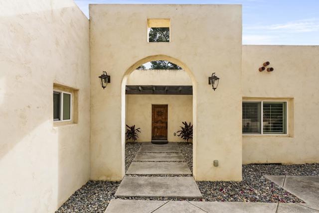 Set on a spacious ¾-acre lot, this well-designed single-story home offers exceptional flexibility and indoor-outdoor living. The open floor plan features a gas fireplace and expansive panoramic doors that open to an extended patio with an optional retractable screened section, creating a seamless connection to the outdoors. The kitchen is both stylish and functional with quartz countertops and ample space for entertaining. The large primary bedroom easily accommodates a sitting area and includes a walk-in closet and walk-in shower. A second oversized bedroom offers an ensuite bathroom and walk-in closet, while additional bedrooms provide versatile living options. Remodeled bathrooms, a large laundry room with sink, tile and manufactured wood flooring, plantation shutters, ceiling fans, and carpeted bedrooms add comfort and appeal throughout. A permitted private casita includes one bedroom, one bathroom, a large walk-in closet, electric stove, refrigerator, and a minisplit AC/heat unit—ideal for guests or multigenerational living. Outdoor highlights include a fenced, heated saltwater pool, extended deck, outdoor kitchen, and a 14-tree orchard. Additional features include a detached two-car garage, EV 220V hookup, 30 owned solar panels with a backup battery providing limited solar power storage, and a substantial front door that makes a strong first impression. Set on a spacious ¾-acre lot, this well-designed single-story home offers exceptional flexibility and indoor-outdoor living. The open floor plan features a gas fireplace and expansive panoramic doors that open to an extended patio with an optional retractable screened section, creating a seamless connection to the outdoors. The kitchen is both stylish and functional with quartz countertops and ample space for entertaining. The large primary bedroom easily accommodates a sitting area and includes a walk-in closet and walk-in shower. A second oversized bedroom offers an ensuite bathroom and walk-in closet, while additional bedrooms provide versatile living options. Remodeled bathrooms, a large laundry room with sink, tile and manufactured wood flooring, plantation shutters, ceiling fans, and carpeted bedrooms add comfort and appeal throughout. A permitted private casita includes one bedroom, one bathroom, a large walk-in closet, electric stove, refrigerator, and a minisplit AC/heat unit—ideal for guests or multigenerational living. Outdoor highlights include a fenced, heated saltwater pool, extended deck, outdoor kitchen, and a 14-tree orchard. Additional features include a detached two-car garage, EV 220V hookup, 30 owned solar panels with a backup battery providing limited solar power storage, and a substantial front door that makes a strong first impression.