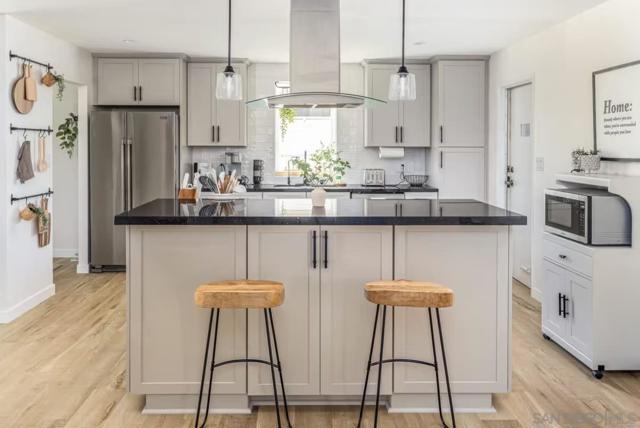 Beautiful Single-Story Home with PAID OFF SOLAR! 3 bedrooms, 2 bathrooms PLUS an Attached ADU with separate gated entrance. The ADU (1 bed, 1 bath) includes a bathroom, separate kitchen and stackable washer & dryer. It's quite large and is currently being used a short term rental. The 3/2 has an inviting and open floor plan, tastefully upgraded kitchen offering granite counter tops, Stainless Steel appliances, attractive professional-grade vent/hood and step up to the bar countertop. Attractive and easy-to-maintain hardwood and laminate flooring throughout. The covered patio in the backyard is a great place for BBQing or just hanging out. This home is a fabulous bargain in todays buyer-challenging marketplace! The suite includes 220 line as well. Incredibly convenient to all in the heart of Clairemont.