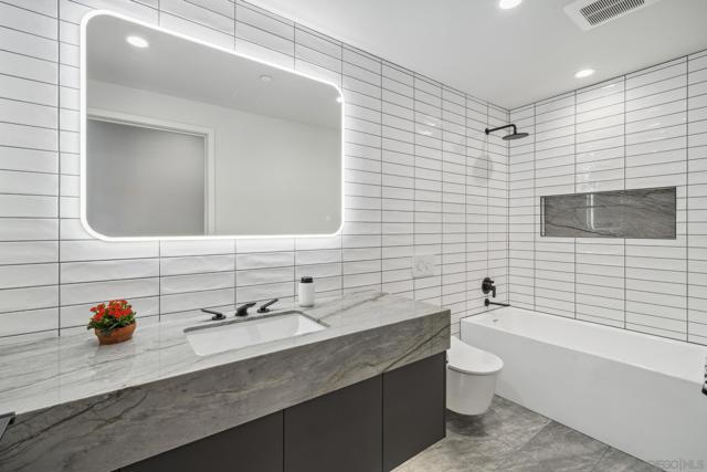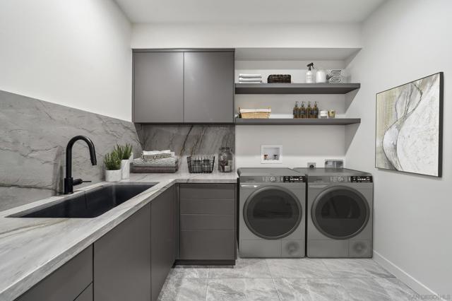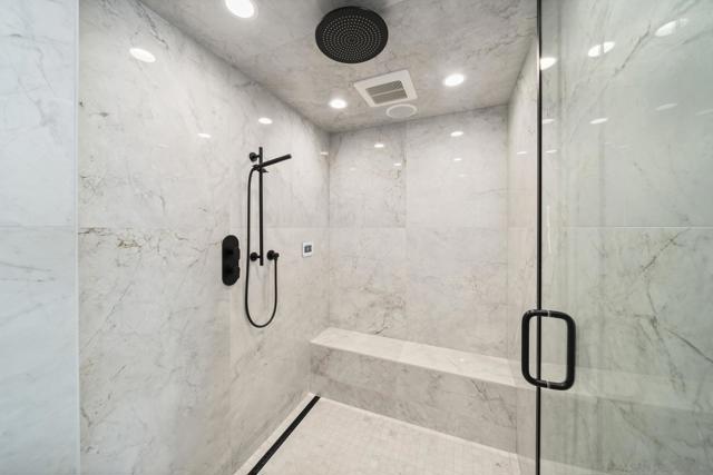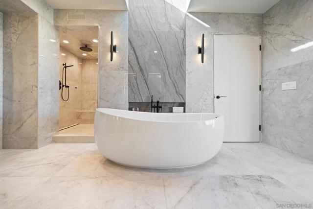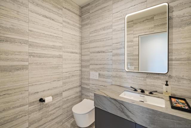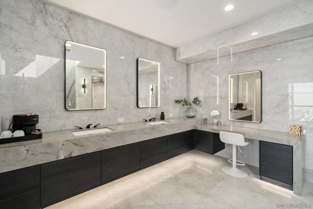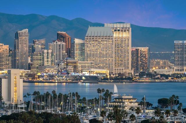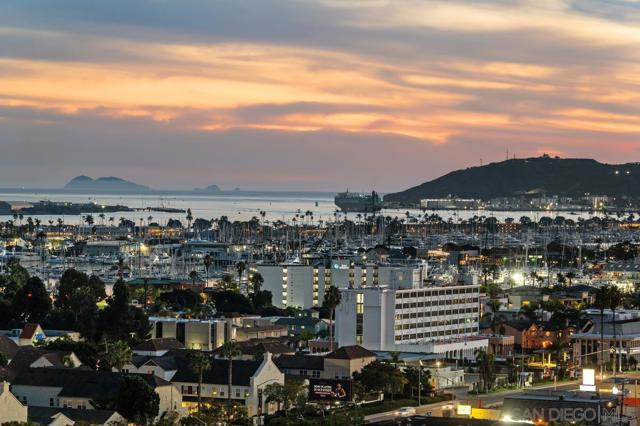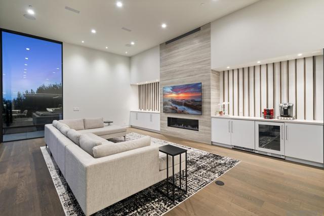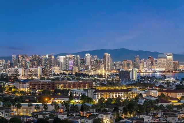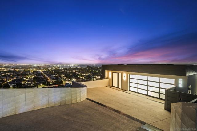 Introducing this one of a kind striking California modern masterpiece envisioned by local architect Daniel Geiger, AIA. This extraordinary residence blends architectural artistry with everyday livability, offering an unmatched fusion of luxury, function, and effortless entertainment. Crafted with low-maintenance, modern materials, the home's bold exterior pairs crisp white plaster with walnut-toned accents, exposed structural steel, and expansive glass walls. The result is a visually dynamic façade that frames a curated journey through panoramic views of the San Diego skyline—an immersive architectural experience as much as a home. Step inside from the third-floor foyer and be instantly captivated by sweeping bay vistas and an abundance of natural light, softly diffused by a louvered canopy above the primary suite's balcony. The primary retreat is nothing short of a sanctuary: a private haven with commanding views of the downtown skyline and bay, and a cantilevered terrace complete with a fire pit—perfect for serene evenings under the stars. The spa-inspired primary bath is a luxurious escape, featuring heated floors, a steam-equipped shower, a sculptural freestanding tub with uninterrupted views, and a spacious custom walk-in closet. Movement through the home is guided by a show-stopping stairwell with waterfall-edge treads and a sleek mixed-metal handrail. A thoughtfully integrated finely appointed elevator adds both refinement and convenience, effortlessly connecting all levels. On the main floor, a dramatic open-plan living area takes center stage. Towering 13-foot Fleetwood sliding glass doors open wide to a vast cantilevered terrace, dissolving the boundary between indoor and outdoor living. Here, enjoy unobstructed, jaw-dropping views of downtown San Diego, the bay, Coronado, and even Mexico on the horizon. The chef’s kitchen is equipped with top-tier appliances and thoughtful design details: custom cabinetry, a 6-burner Wolf rangetop with griddle, panelized Miele dishwasher, Sub-Zero side-by-side fridge and freezer, and a discreet walk-in pantry. Nearby outdoor spaces feature a built-in BBQ station nestled against a dramatic wood grain board-formed concrete wall and a buffet-sized natural quartzite serving counter perfect for outdoor entertaining. The home features four spacious bedrooms, a media room, a family room, a living room, and three and a half impeccably appointed bathrooms—each crafted with its own character, blending elevated design with warm functionality. This is more than a residence—it's a living work of art, designed for those who appreciate bold architecture, sophisticated luxury, and unforgettable views. Welcome to your front-row seat to San Diego’s skyline.