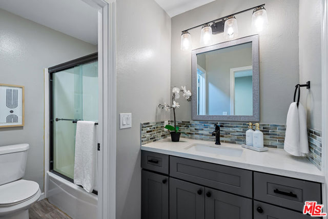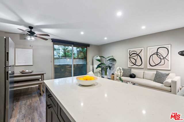 Beautifully remodeled and thoughtfully designed, this stylish Brentwood condo offers modern comfort with refined finishes throughout. The open layout maximizes nearly 600 square feet of usable living space, enhanced by wide-plank laminate flooring, contemporary recessed lighting, and a striking wood barn-style sliding door that separates the bedroom area while maintaining a seamless flow. The updated kitchen features soft-close cabinetry, quartz countertops, stainless steel appliances, a farmhouse sink, mosaic backsplash, under-cabinet lighting, and a center island. The living area includes a fireplace that serves both the living and bedroom spaces, while sliding glass doors with designer blinds open to a private balcony. Additional highlights include an ensuite bathroom with a separate vanity area, a walk-in closet, and modern fixtures throughout. Ideally positioned at the rear of the building, the unit offers a quiet, private setting with convenient access to the rear elevator. The secure community offers desirable amenities including a pool, spa, sauna, on-site laundry, and lobby security most evenings. Ideally located near Montana Ave and San Vicente Blvd, with close proximity to neighborhood favorites such as Whole Foods Market, Great White, Baltaire, La La Land, Alfred Coffee, and a wide array of dining and shopping options. A turnkey opportunity in one of Brentwood's most desirable locations.