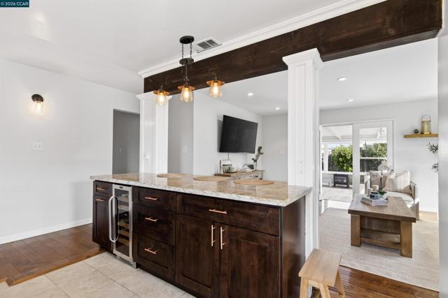 Storybook curb appeal meets modern comfort. This delightful single-story rancher invites entertaining & everyday ease: bright, open living spaces, polished touches throughout. A gem combining modern flair with storybook charm, perfect for entertaining or unwinding. Engineered hardwood floors, newer paint and carpeting set a crisp, welcoming tone. The remodeled kitchen is a chef’s dream: spacious cabinetry, stainless steel appliances, gas stove, granite counters, generous island with seating, designer lighting, and a wine fridge. A versatile sunroom adds flexible living space—ideal for relaxed mornings, entertaining, and more—and flows seamlessly to the spacious backyard. Outdoor living shines with multiple patios, a BBQ, paver walkways, raised garden beds, and a stylish shed/playhouse—great for hobbies, storage, or kid-friendly fun. 3 comfortable bedrooms include a serene master suite with its own bath, offering plenty of room for everyone. Upgrades include an attached 2-car garage with epoxy flooring, electric car hookups, laundry hookups, and new roof in 2024. Located near groceries, shops, and dining, this warm, welcoming neighborhood gem is ready for you to move in and make memories. Don’t miss your chance—come see why this enchanting turn-key property is your perfect home!