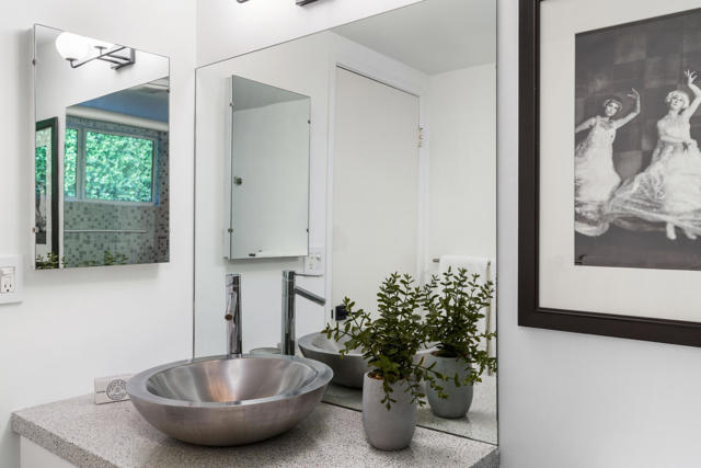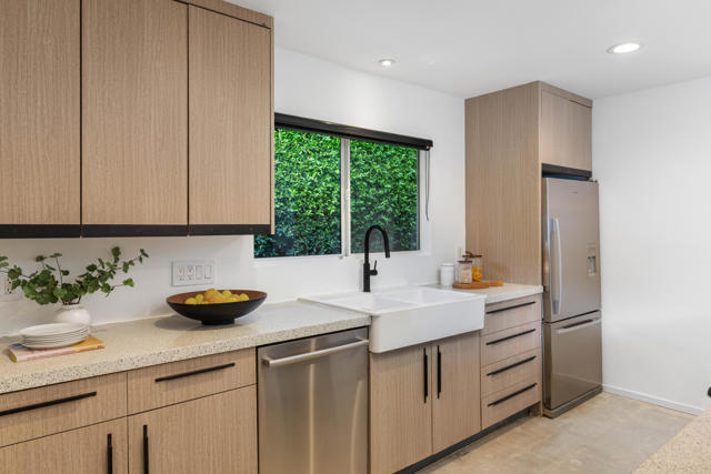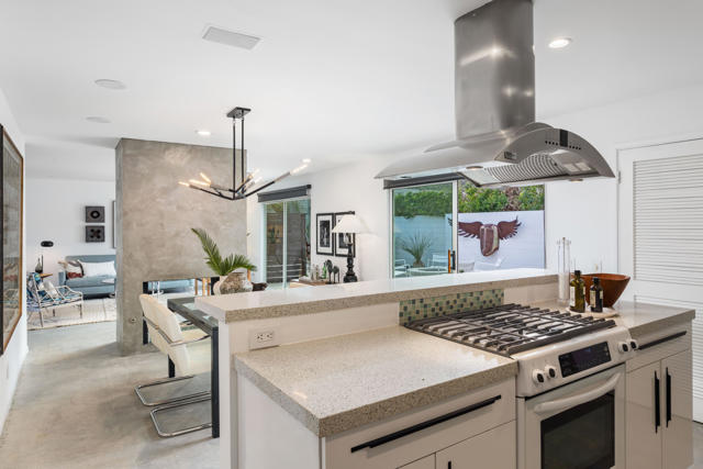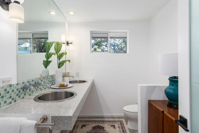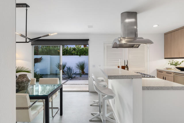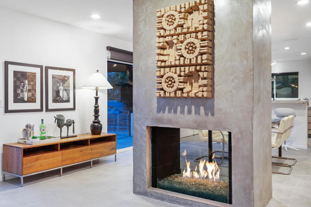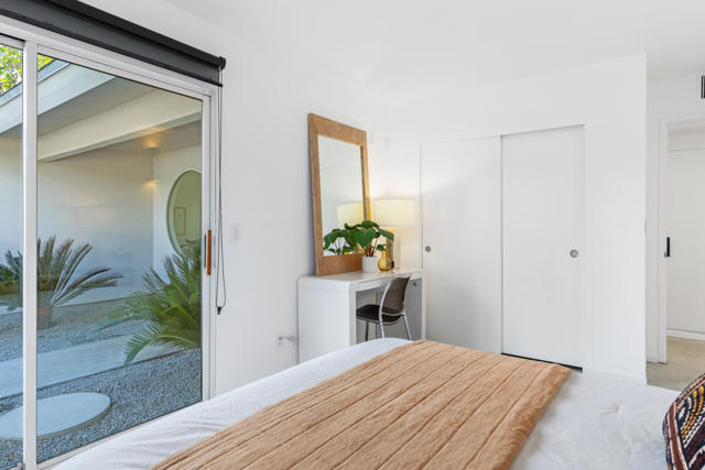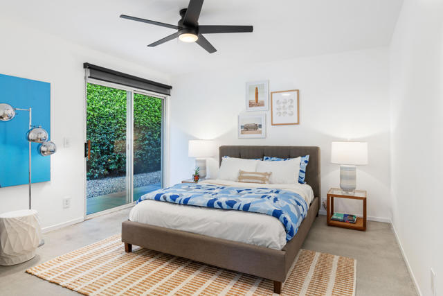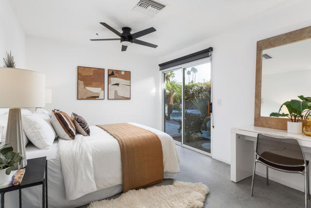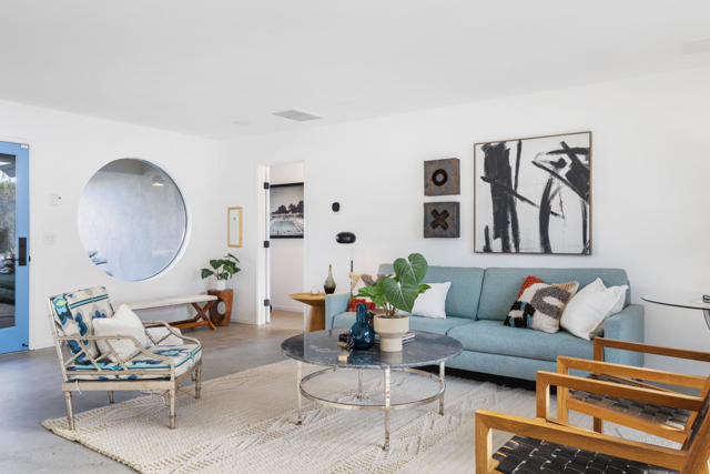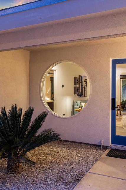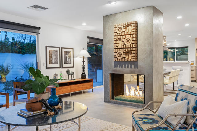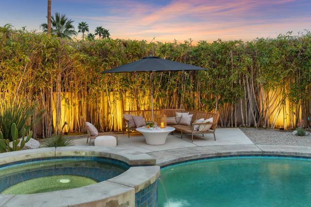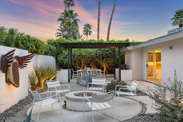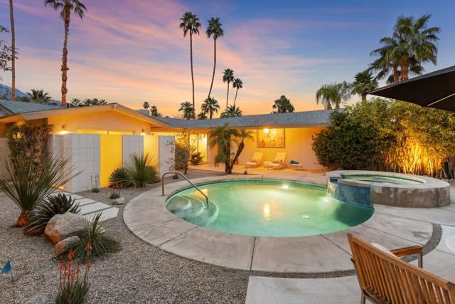 Super Private Mid Century Modern Oasis...This glamorous 3 bed, 2 bath home was built in 1961 by the famed Alexander Construction Company and is now fully remodeled and reimagined for modern living. Enter through the gated front yard with privacy hedges on all sides and into your own Palm Springs paradise. Beautiful landscape surrounds a raised round spa trickling into a perfectly circular salt water pool. The house has a huge round window overlooking the pool area creating an iconic architectural statement. There are delightful seating areas all around the front and back of the house for admiring the mountain views and swaying palm trees. And of course there is a charming round fireplace for fireside chats. Inside there are new polished concrete floors throughout, a double sided fireplace and a handsome remodeled kitchen with modern appliances. The primary suite on one side of the house has a large walk-in closet and a huge spa-like bathroom with sliding doors out to the pool. On the other side of the house are 2 spacious guest bedrooms and a large remodeled bathroom. The 2 car garage is detached. This stunning home is being sold partially furnished as shown (with exceptions). It is located in the south end of town away from the wind with no power lines in sight. The highly desirable Tahquitz Creek Golf neighborhood has NO HOA and NO LAND LEASE. Viewings by appointment only.