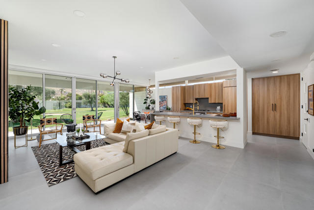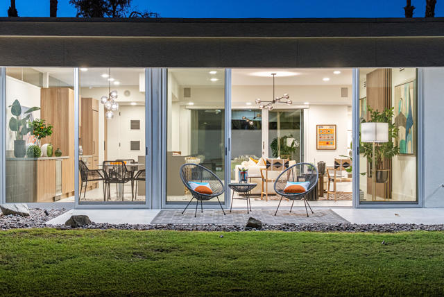 Discover a rare opportunity to own a piece of Palm Springs history with this 2-bedroom, 2-bath home, originally designed in 1967 by renowned architect Richard E. Harrison and redesigned in 2025. Among the first residences built in the iconic Seven Lakes Golf & Country Club, this home combines timeless mid-century modern architecture with thoughtful contemporary updates--all in a serene cul-de-sac setting overlooking the second fairway of the Ted Robinson-designed executive golf course. Inside, you'll find a light-filled, open layout designed to blur the lines between indoor and outdoor living. The updated kitchen and bathrooms feature sleek finishes, custom cabinetry, and premium appliances, while walls of glass invite natural light and frame striking mountain and golf course views. With a modern living room fireplace, an upgraded electrical panel, owned solar system and double paned sliding doors/windows, this residence offers eco-conscious upgrades that lower your carbon footprint while elevating the home's comfort and style. The versatile second bedroom can easily serve as a guest suite, home office, or private retreat. Large sliding doors showcase the tranquil courtyard and mountain backdrop, creating a relaxing escape within your own home. Behind the guarded gates of Seven Lakes, residents enjoy access to an array of amenities including a private clubhouse with restaurant and bar, 15 heated pools and spas, tennis and pickleball courts, and the signature Ted Robinson golf course. An assigned carport adds convenience with parking and extra storage. This home embodies the Palm Springs lifestyle--architectural pedigree, modern upgrades, sustainability, and resort-style living in one of the desert's most sought-after communities.