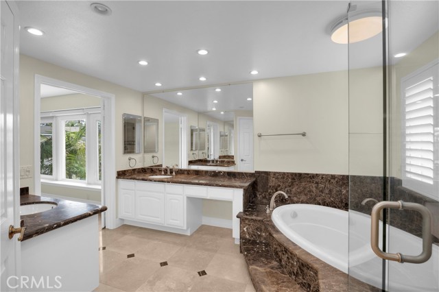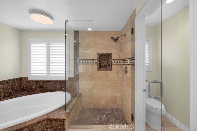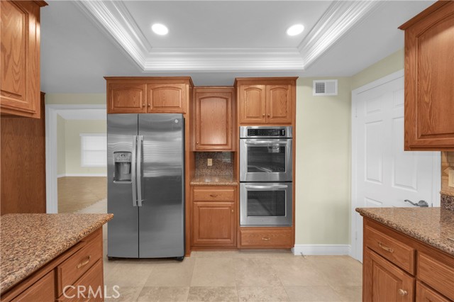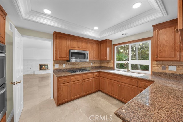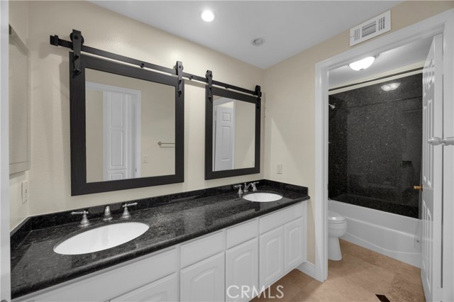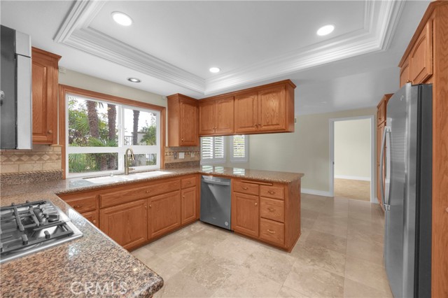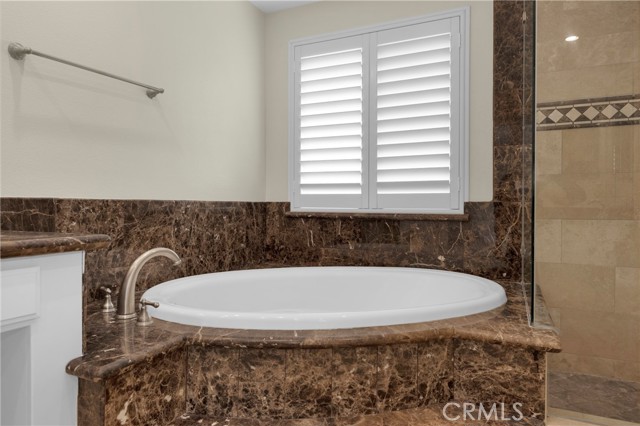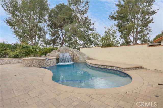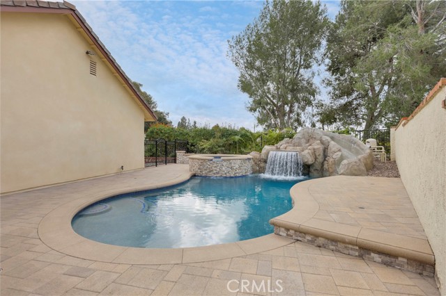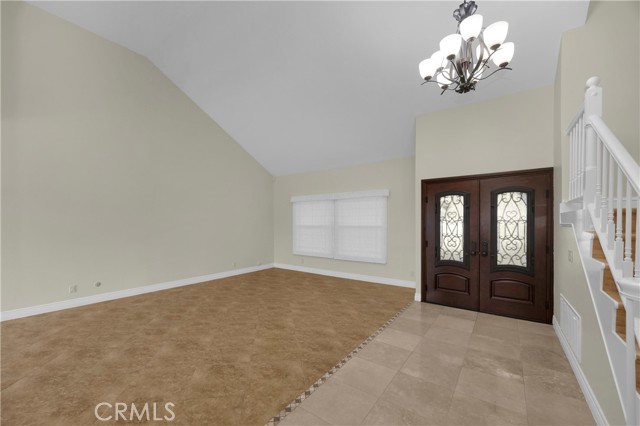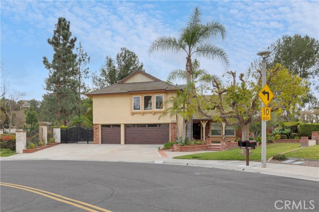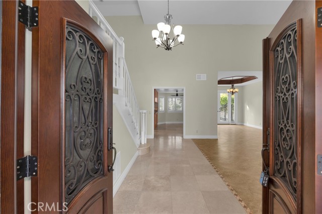 Welcome to 19828 Paseo Lorenzo, a beautifully upgraded lease opportunity in the highly sought-after East Lake Village community of Yorba Linda. Offering 2,569 square feet of living space on an expansive 12,650 square foot lot, this 4-bedroom, 3-full-bath home includes a highly desirable downstairs bedroom and bath—ideal for guests, multi-generational living, or a private office setup. Impressive curb appeal begins with custom brick hardscape, pilaster lighting, and a stunning wood and iron double-door entry. Inside, vaulted ceilings and tile flooring enhance the living room, while the formal dining room features a striking copper ceiling, chandelier, and French doors that open to the backyard for seamless indoor-outdoor entertaining. The kitchen showcases granite countertops, stainless steel appliances including a double oven, and opens to the inviting family room with a brick fireplace, large slider to the yard, and a built-in bar area with granite counters and sink. Upstairs, travertine stairs lead to the spacious primary suite with tile flooring, a generous walk-in closet, and a beautifully appointed bath featuring dual marble vanities, a soaking tub, and a seamless glass shower. Secondary bedrooms offer ceiling fans, mirrored wardrobe doors, and custom details. The upstairs bath includes travertine floors, granite dual vanities, and a tub/shower combination with granite surround. A convenient upstairs laundry chute adds everyday practicality. The resort-style backyard is designed for entertaining, featuring a gated pool and spa with slide, paver decking, built-in barbecue, artificial turf, and additional side-yard concrete parking. Additional highlights include an interior laundry room and a three-car attached garage with workbench area. Residents of East Lake Village enjoy outstanding community amenities including multiple pools and spas, a private lake with walking paths, clubhouse, fitness center, tennis courts, sport courts, and year-round community events—all contributing to a true resort-style lifestyle. This exceptional lease offers comfort, elegance, and access to one of Yorba Linda’s most desirable master-planned communities.
