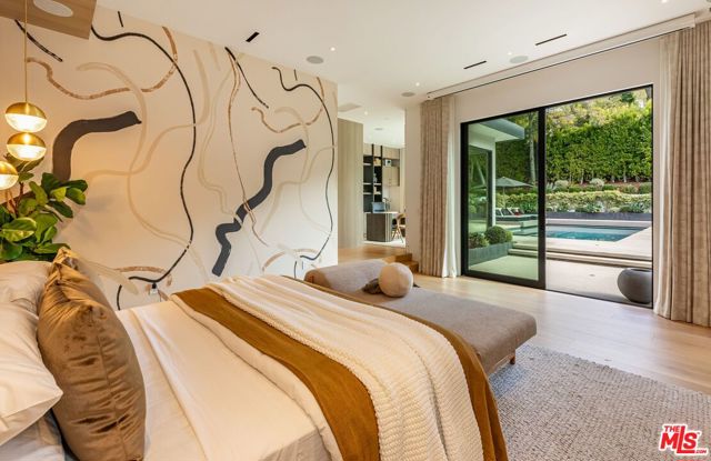 Fully renovated modern home in BHPO on a quiet street in Coldwater Canyon. Just beyond the front door, the formal living room has beamed ceilings and looks out to the spacious backyard. The dining room conveniently blends into the kitchen which features gorgeous black porcelain counters and high-end appliances, including double Sub-Zero refrigerators and 48-inch Wolf range. Glass walls allow natural light to fill the space and highlight the beautiful finishes and textures of the home, Fleetwood windows and doors throughout. The spacious primary suite features build projector and drop-down 130-inch screen, and offers a tranquil spa-like bathroom. Oversized sliding doors open for seamless indoor/outdoor living and entertaining featuring six-zone audio system. The sparkling pool with oversized spa is surrounded by areas for lounging, a built-in fire pit with seating, room for dining al fresco, and lush landscaping. This exquisite home flawlessly combines luxury and tranquility, making it the perfect retreat for sophisticated living and entertaining.